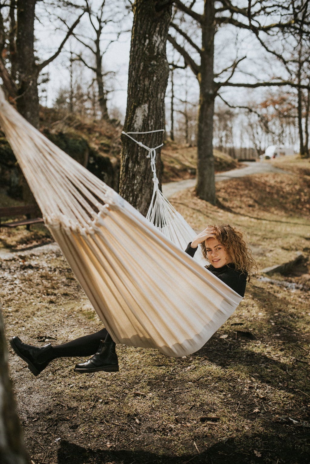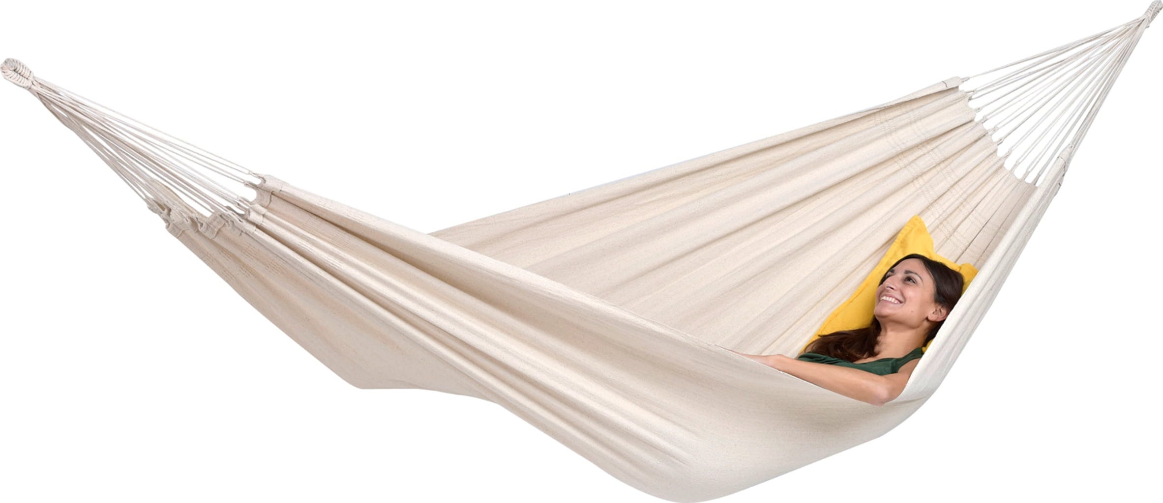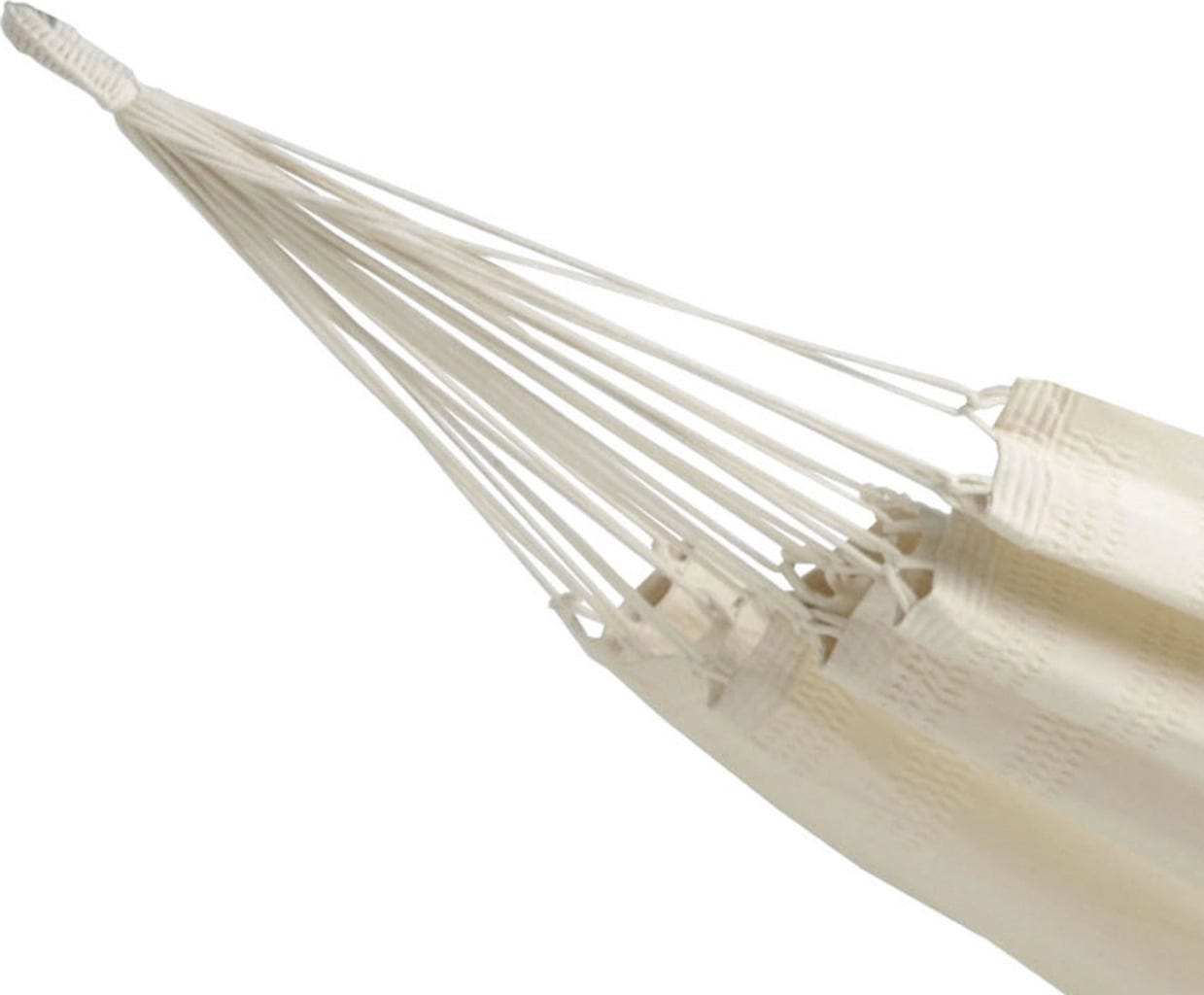 Gęsty materiał o gramaturze 400 g/m² wytrzymuje obciążenie do 200 kg, dzięki czemu hamak można nawet dzielić na dwa osoby. Ręcznie tkane i podwójnie 5-krotnie przeszywane oczka tworzą solidną bazę dla wielu linek, gwarantując wyjątkową stabilność. Idealne miejsce do relaksu, odpoczynku i zastosowania brazylijskiej techniki bujania, by dusza mogła się odprężyć!