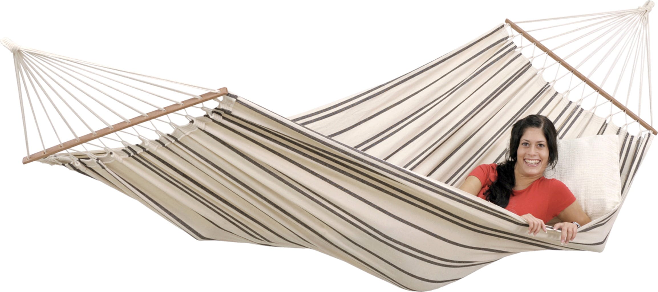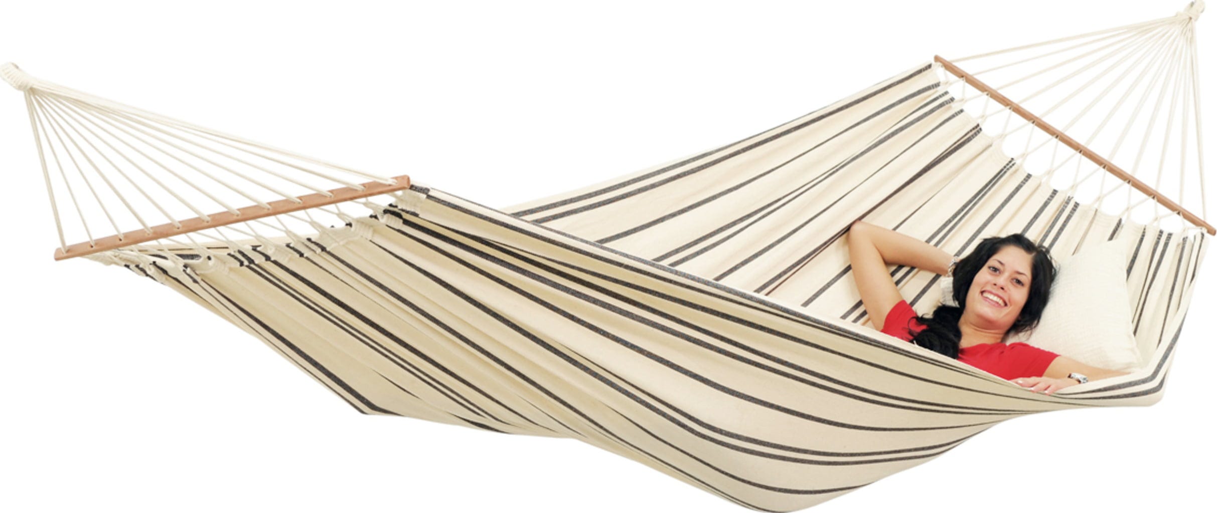Szerokość materiału 140 cm i długość drążka 100 cm zapewniają XL hamak z drążkiem Brasilia piękną krzywiznę, idealną do wygodnego relaksu. Miękki, gęsto tkany materiał gwarantuje maksymalny komfort leżenia. Ręcznie wiązane drążki z twardego drewna zapewniają stabilność i utrzymują hamak otwarty. Liczne linki mocujące równomiernie rozkładają ciężar, dając uczucie lekkości unoszenia.