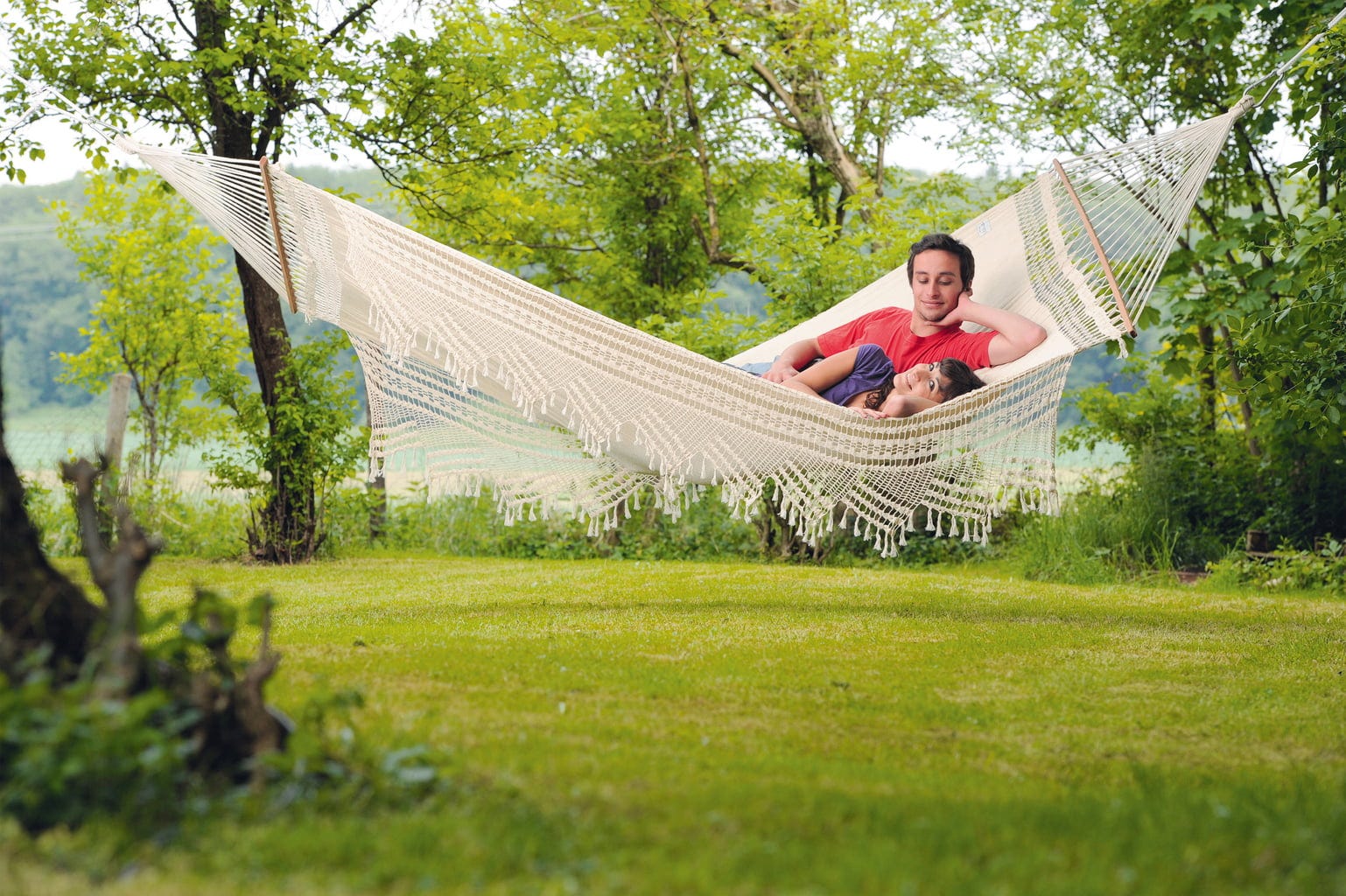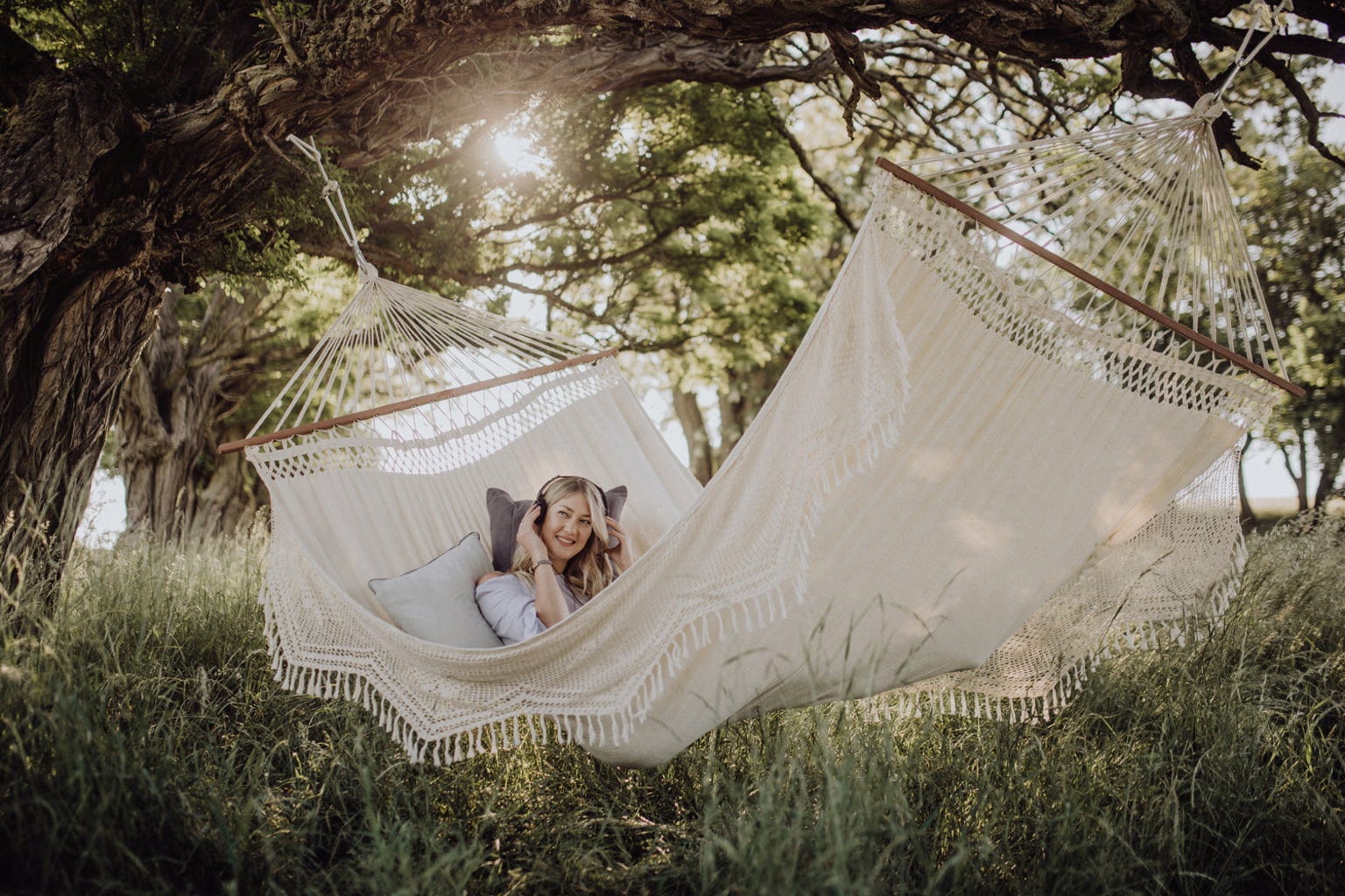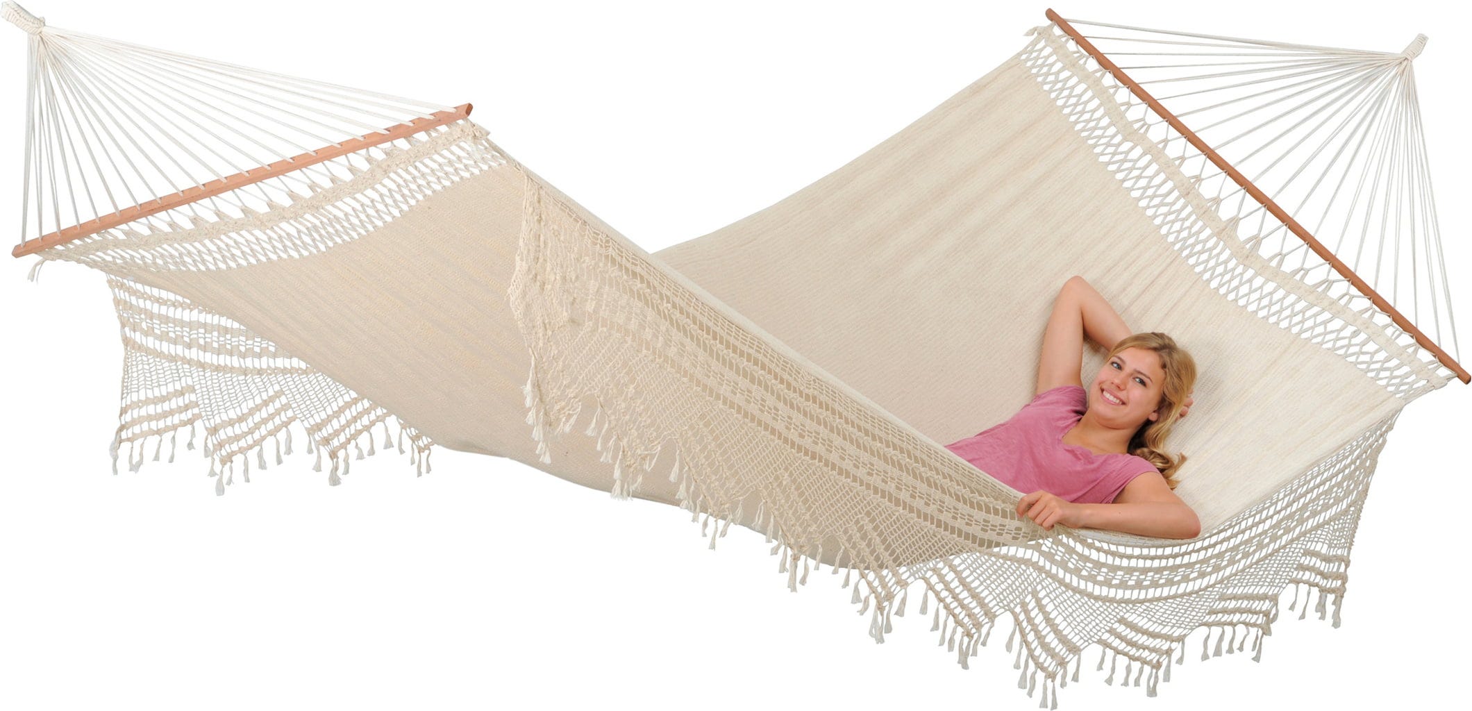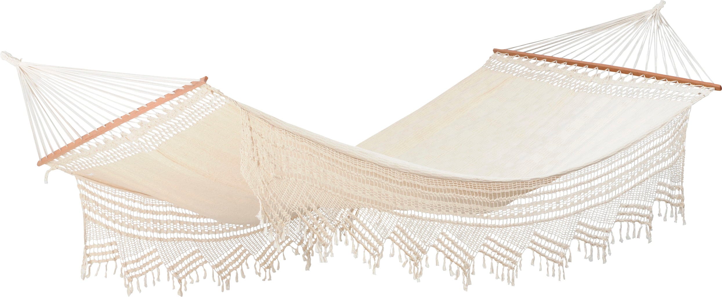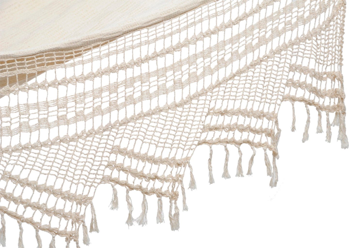 XXL hamak z drążkiem Palacio natura zachwyca nie tylko swoim uroczym boho designem, ale także dużą powierzchnią leżenia! Dzięki nośności do 200 kg, w hamaku może jednocześnie odpoczywać nawet trójka osób!