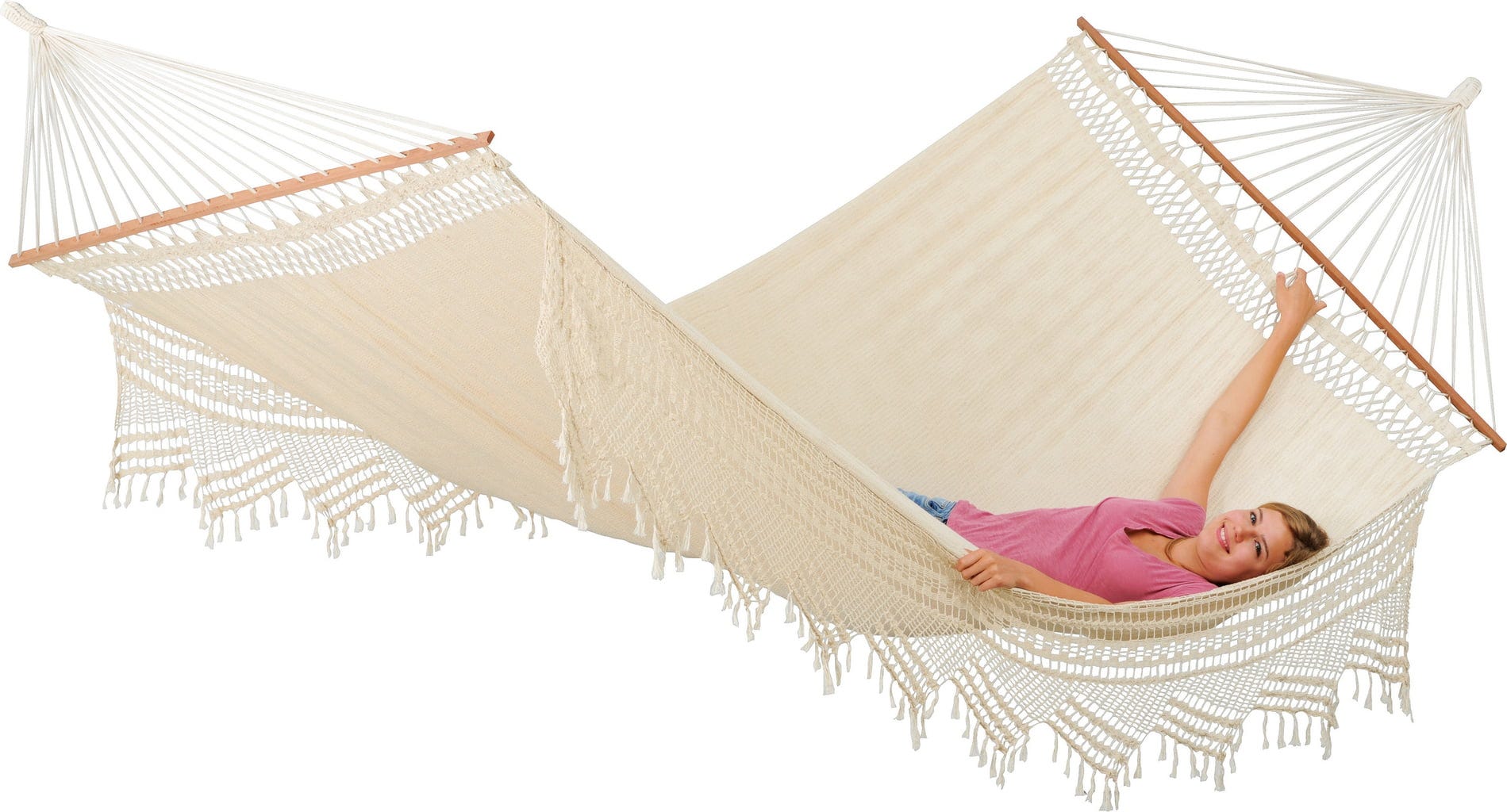 Piękna, ręcznie wiązana ozdobna lamówka oraz inne elementy makramy między tkaniną hamaka a drewnianymi drążkami nadają hamakowi wyjątkowy wygląd, podczas gdy unikalna technika tkania żakardowego zapewnia wyjątkowy komfort leżenia. Solidne, twarde drewniane drążki gwarantują stabilność hamaka, a grube linki, ręcznie połączone taśmą tkacką, równomiernie rozkładają punktowe obciążenia.