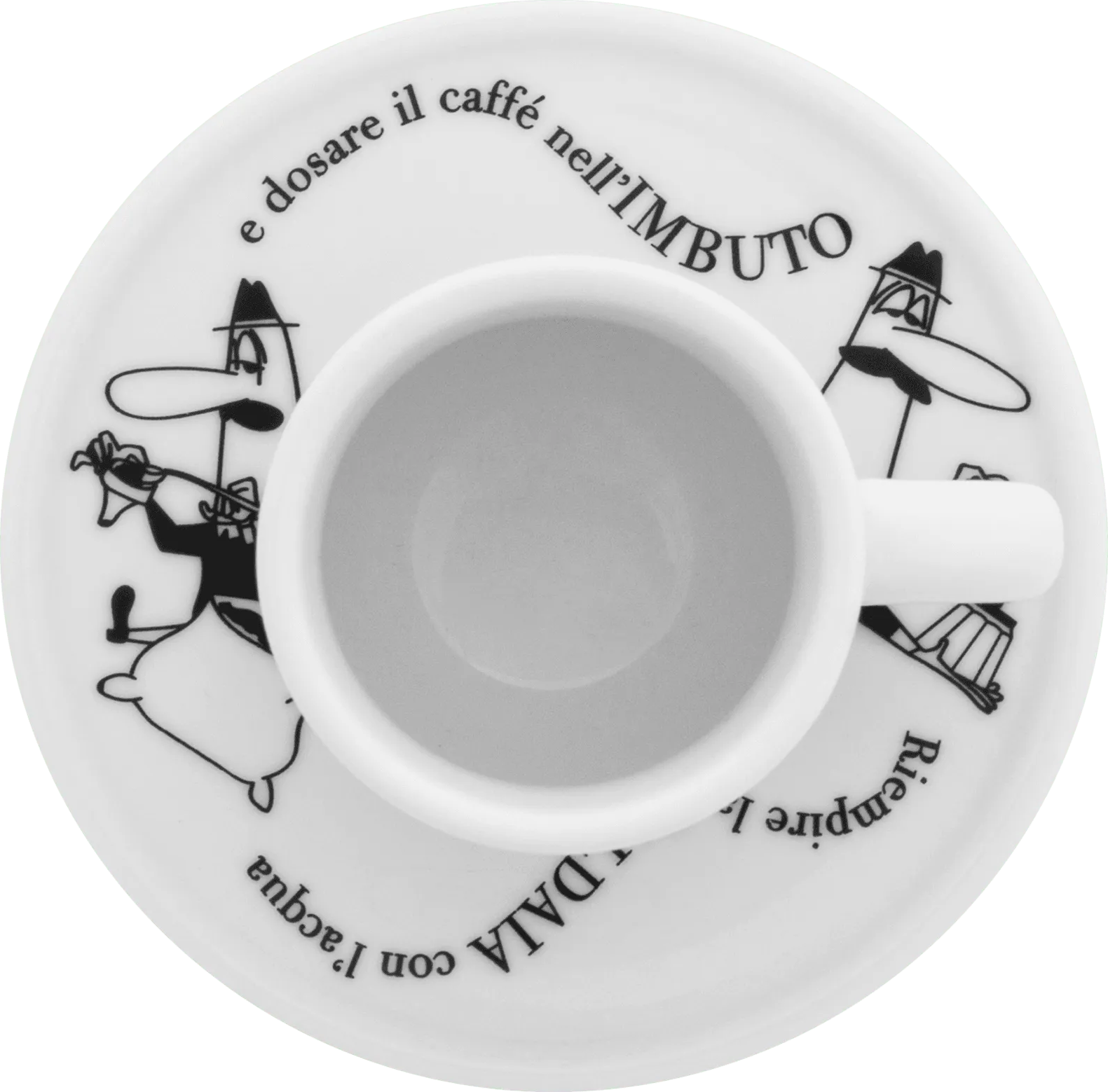 Dekoracyjnie zaprojektowany z kultowym ludzikiem Bialetti, zestaw filiżanek do espresso przedstawia etapy przygotowania kawy na spodkach.