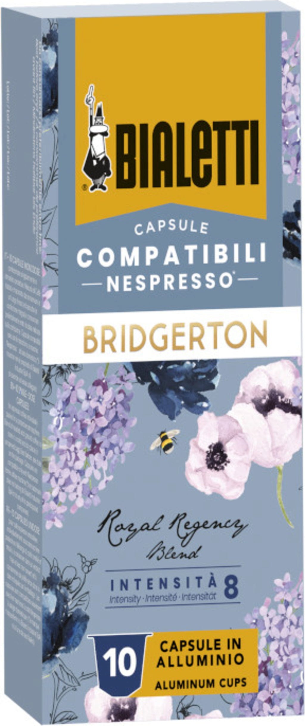 Kawę Bridgerton można również wyczarować za pomocą ekspresu Nespresso. Wyrafinowana mieszanka 80% Arabiki i 20% Robusty rozpieszcza podniebienie żywymi, kwiatowymi smakami, które dodają wyjątkowego charakteru każdemu łykowi. Wspaniały sposób na przeniesienie królewskiej przyjemności picia kawy do własnych czterech ścian.