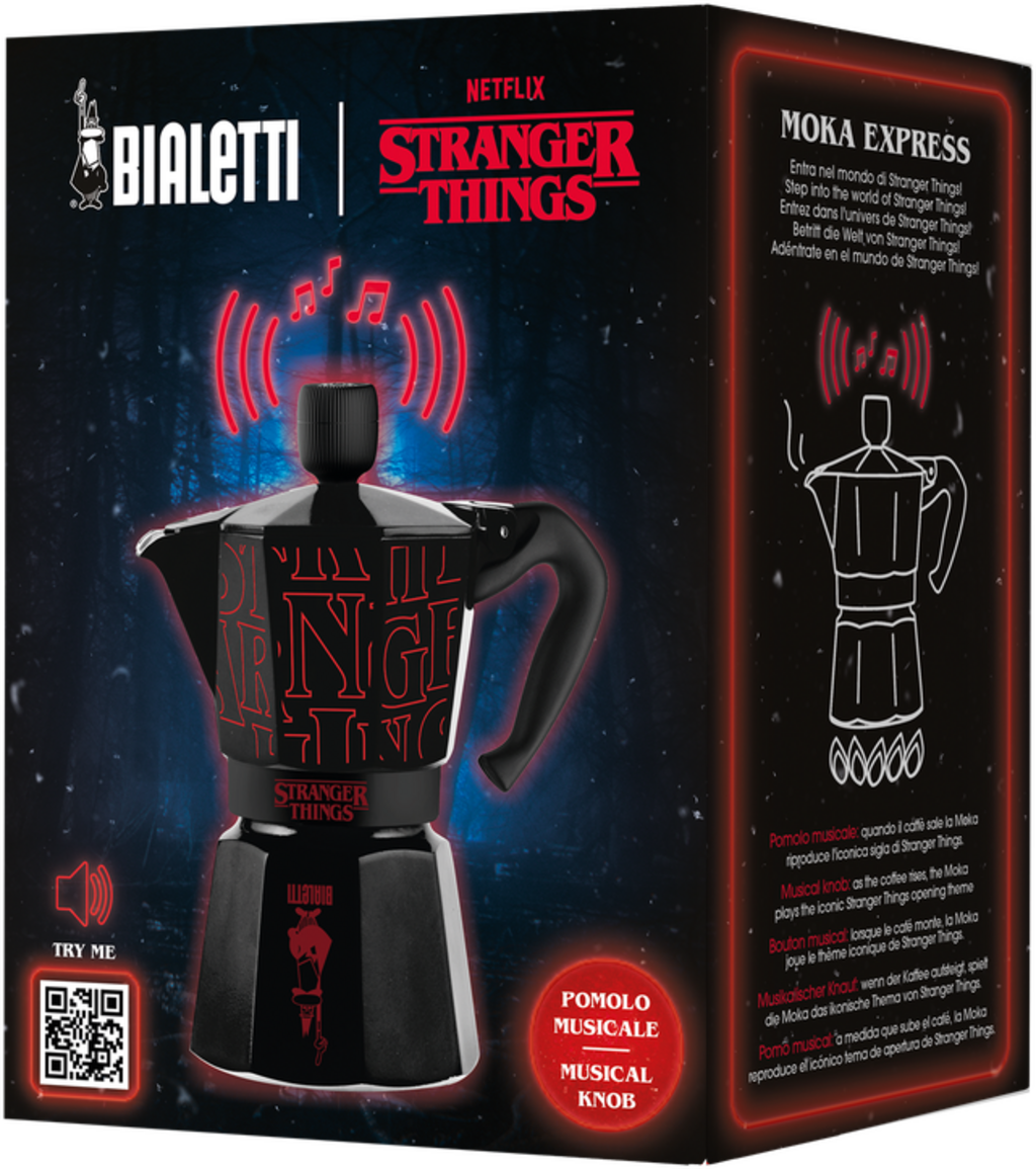 Dzbanek do espresso z motywem "Stranger Things" może zrobić jeszcze więcej: głośnik zintegrowany z pokrętłem pokrywy odtwarza dźwięk Stranger Things podczas procesu parzenia. Absolutny must-have dla wszystkich fanów kultowego serialu i oczywiście wspaniały prezent.