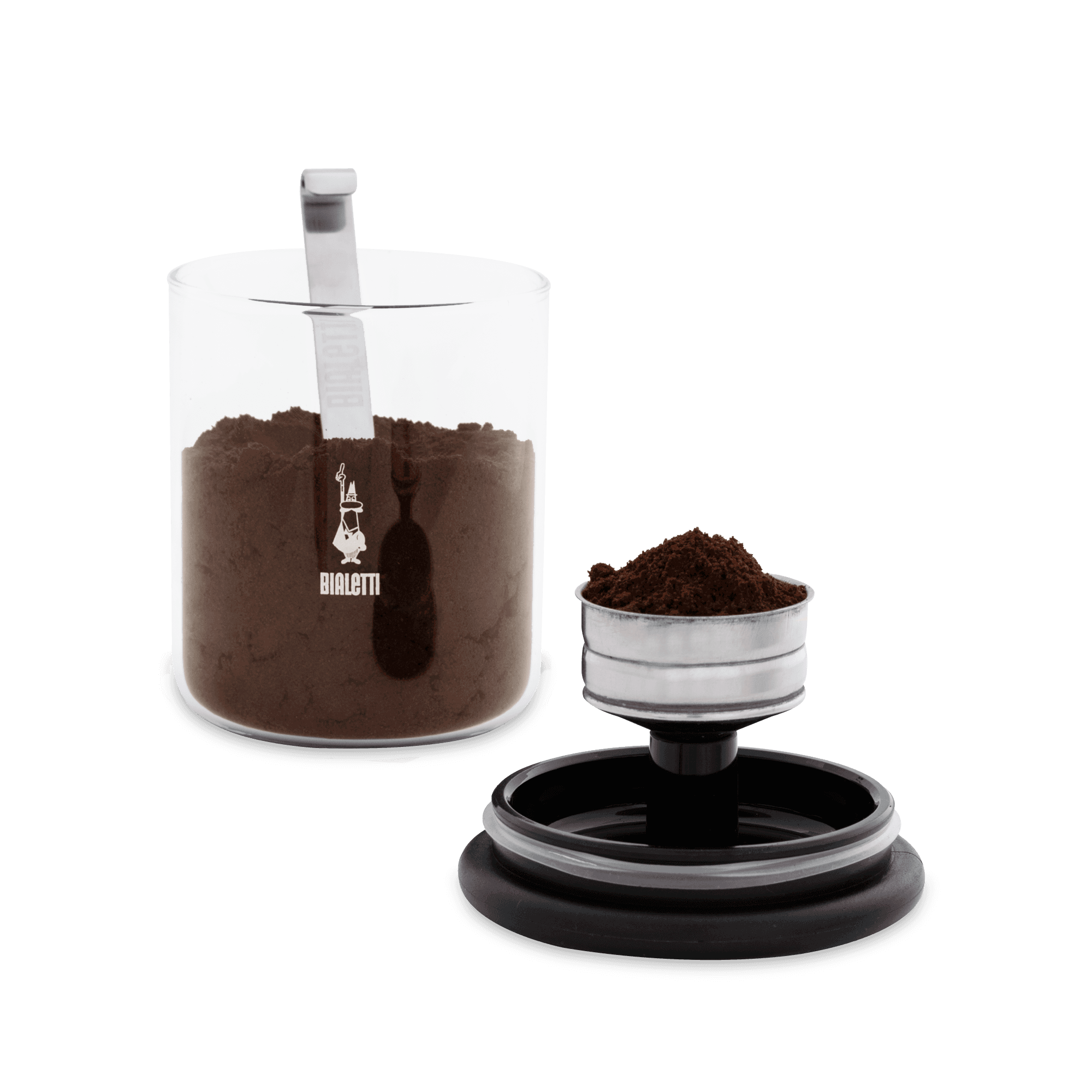 Ta elegancka puszka na kawę z ozdobnym logo Bialetti nie tylko dobrze wygląda, ale także zachwyca praktycznymi detalami. Lejek ekspresów do kawy można włożyć w hermetyczne zamknięcie i napełnić. Nadmiar kawy mielonej opada do pokrywy i dzięki temu nie jest marnowany. Łyżkę ze stali nierdzewnej można zawiesić na pokrywce, aby zaoszczędzić miejsce i zachować dekorację.