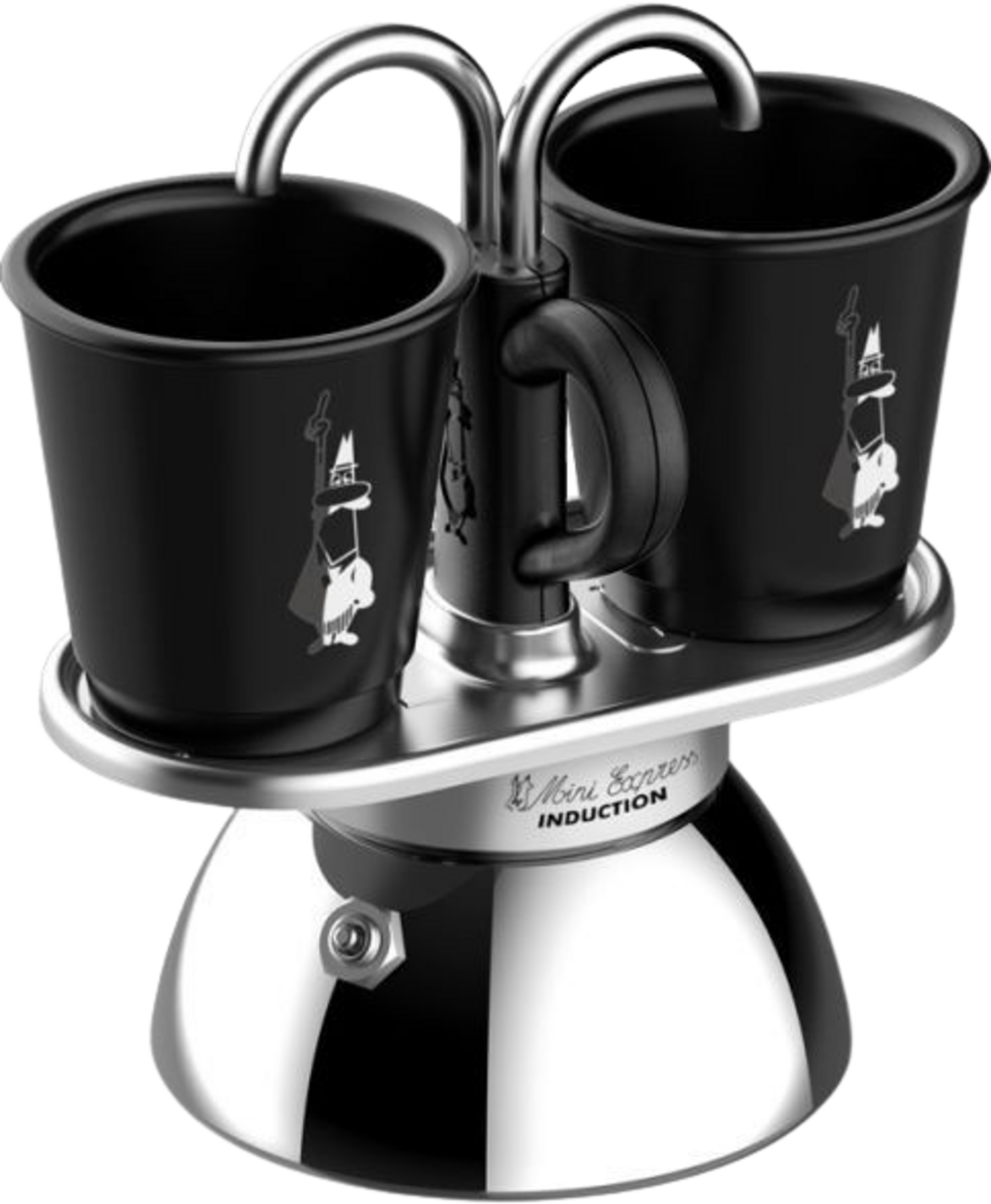 Kompatybilny z indukcją zestaw Mini Express firmy Bialetti składa się z ekspresu do kawy i 2 filiżanek, które są podgrzewane podczas przygotowywania kawy dzięki specjalnej aluminiowej tacy. Kawa przepływa bezpośrednio z kawiarki do kubków.