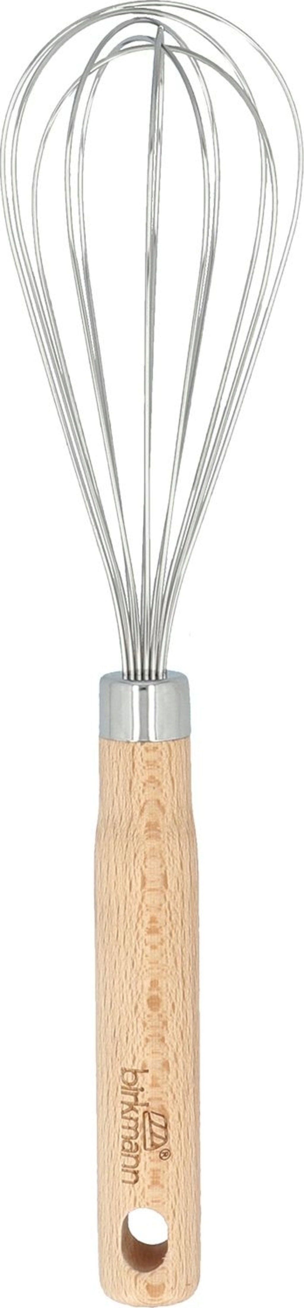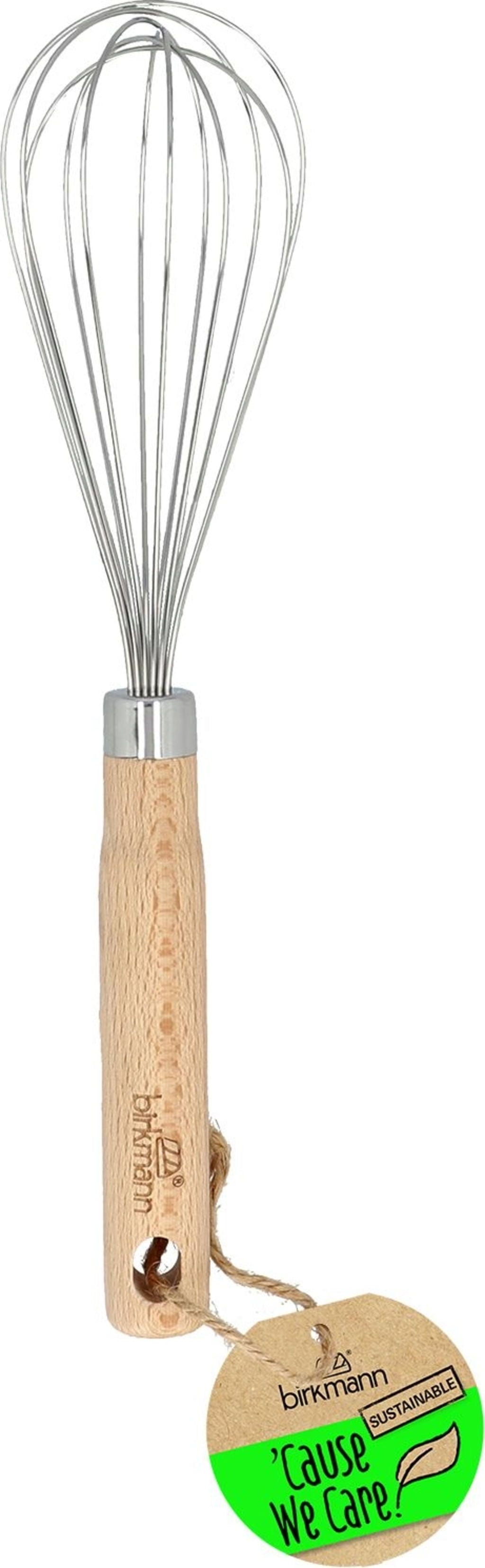 Trzepaczka, wykonana z drewna i stali nierdzewnej, nie tylko dobrze leży w dłoni, ale także zapewnia dokładnie wymieszanie kremów, śmietany, ciasta i wielu innych.