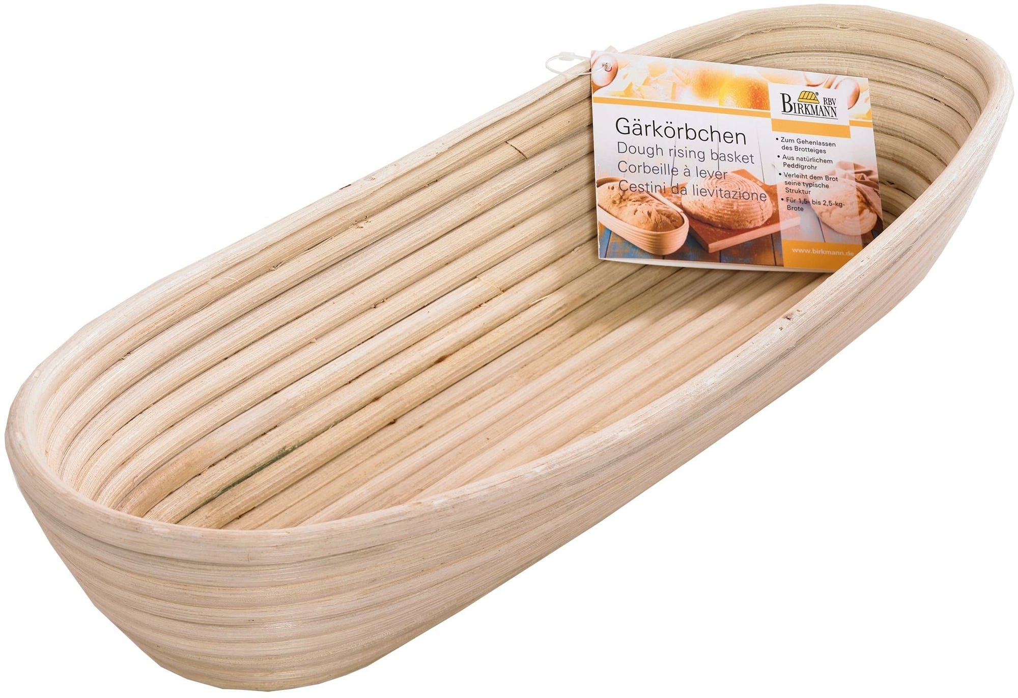 Podłużny kosz jest idealny do wyrastania ciasta chlebowego. Stabilizuje ciasto podczas wzrostu i chroni je przed wysychaniem. Zastosowany materiał to naturalny rattan, z którego często korzystają również profesjonalni piekarze. Kształt kosza nadaje chlebowi charakterystyczny wzór rowków.