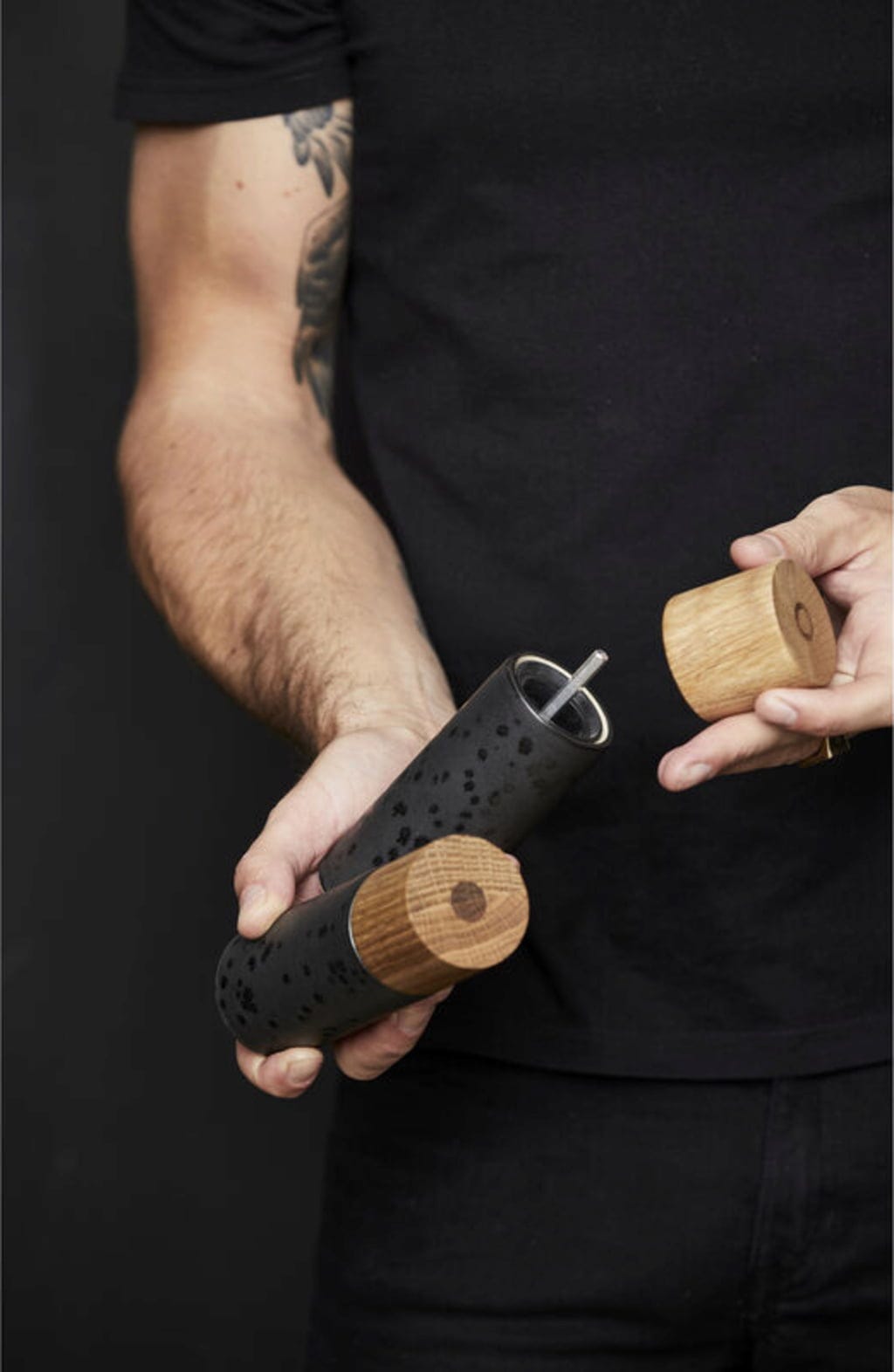 Ten zestaw młynków do soli i pieprzu jest wykonany z matowej, szkliwionej kamionki i zamykany piękną pokrywką z drewna dębowego. Design jest prosty, ale elegancki i wygląda stylowo na każdym stole. Młynki są wyposażone w trwały, ceramiczny mechanizm mielący, są wygodne do trzymania i łatwe do obracania.