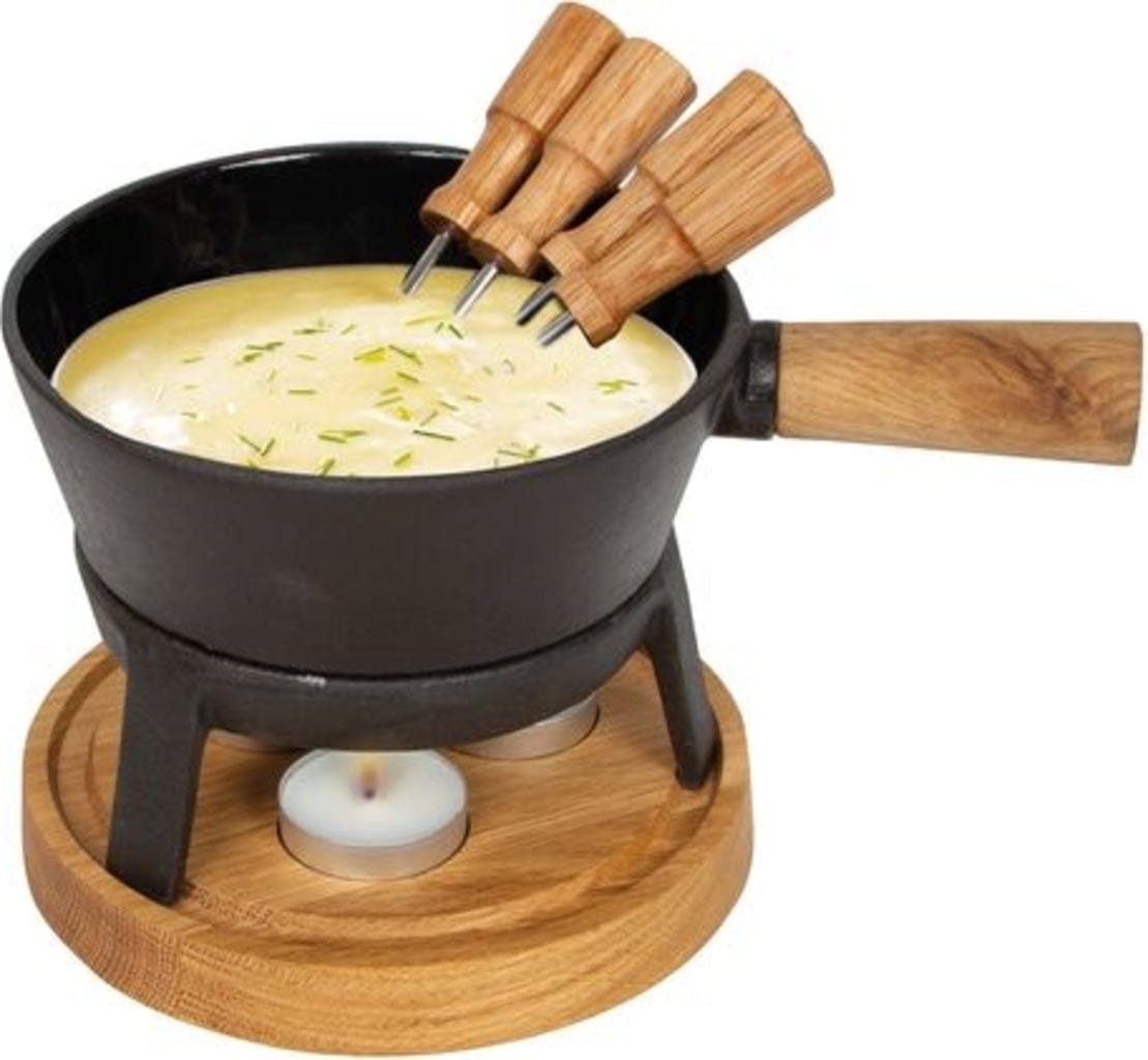 Gotowe! Dzięki temu zestawowi aż cztery osoby mogą zasiąść i delektować się pysznym fondue przez cały wieczór. Do garnka ceramicznego włóż maksymalnie 350 g sera i postaw go na kuchence elektrycznej, gazowej lub indukcyjnej. Gdy ser się roztopi, garnek ustawia się na stylowej dębowej ramie. Tutaj trzy świeczki służą jako źródło ciepła, dzięki czemu ser pozostaje cudownie kremowy przez wiele godzin.