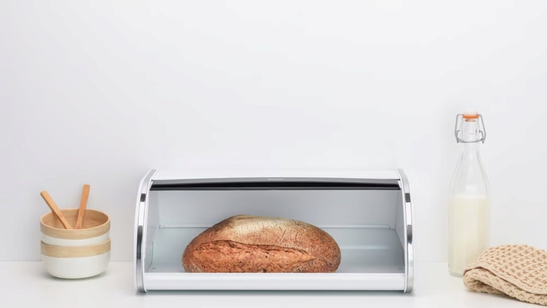 Niezależnie od tego, czy jest to chleb biały, razowy czy rogaliki - ten elegancki pojemnik na pieczywo oferuje miejsce na maksymalnie dwa bochenki chleba i utrzymuje ich świeżość na dłużej dzięki podstawie z wypustkami. Pokrywa cicho wsuwa się do środka, oszczędzając miejsce na blacie roboczym, a na górze jest nawet miejsce na zapasy.