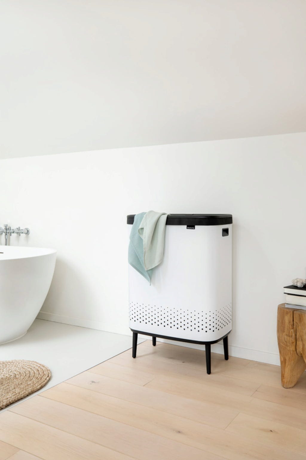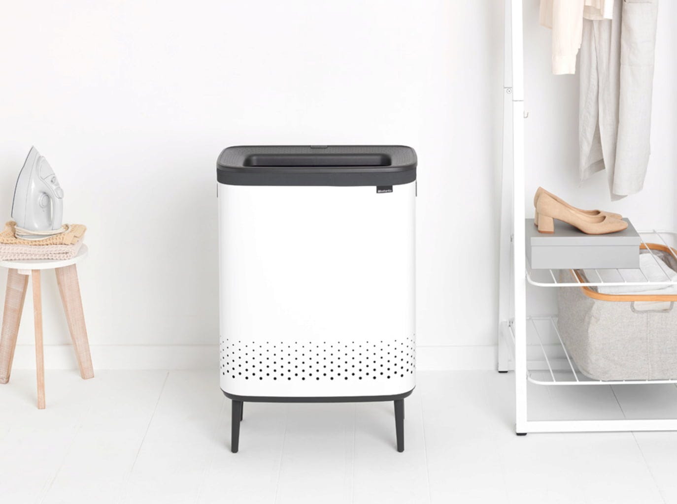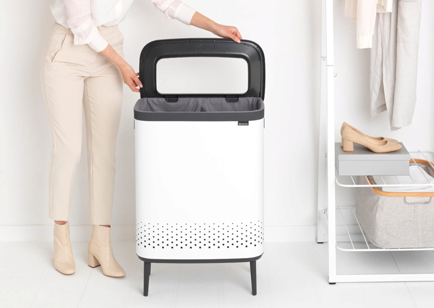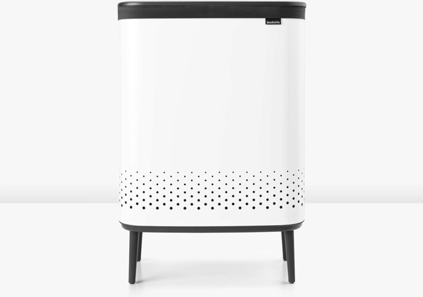 Wspaniały kosz na pranie Bo Hi pozwala łatwo oddzielić pranie, ponieważ składa się z dwóch oddzielnych pojemników na pranie, każdy o pojemności 45 litrów. Możesz na przykład idealnie oddzielić czerwony T-shirt od białego prania i uniknąć różowych niespodzianek.