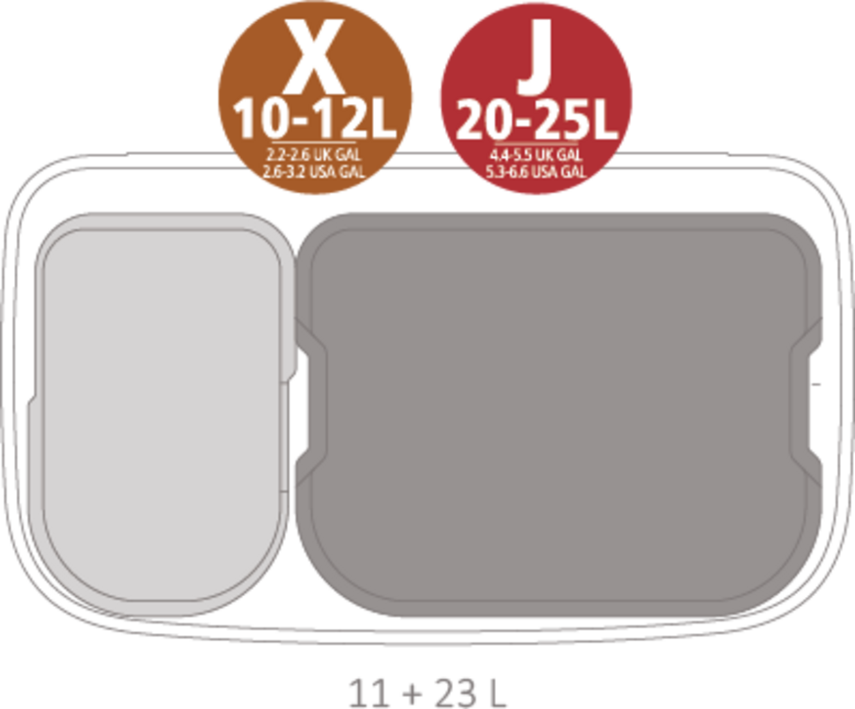 - Pasujące worki na śmieci brabantia: Code X (12 litrów) i Code J (20-25 litrów)