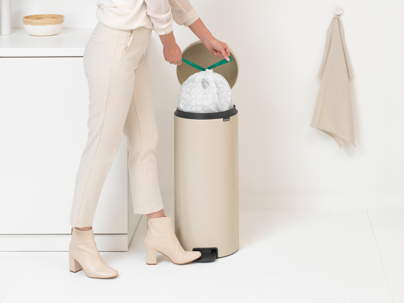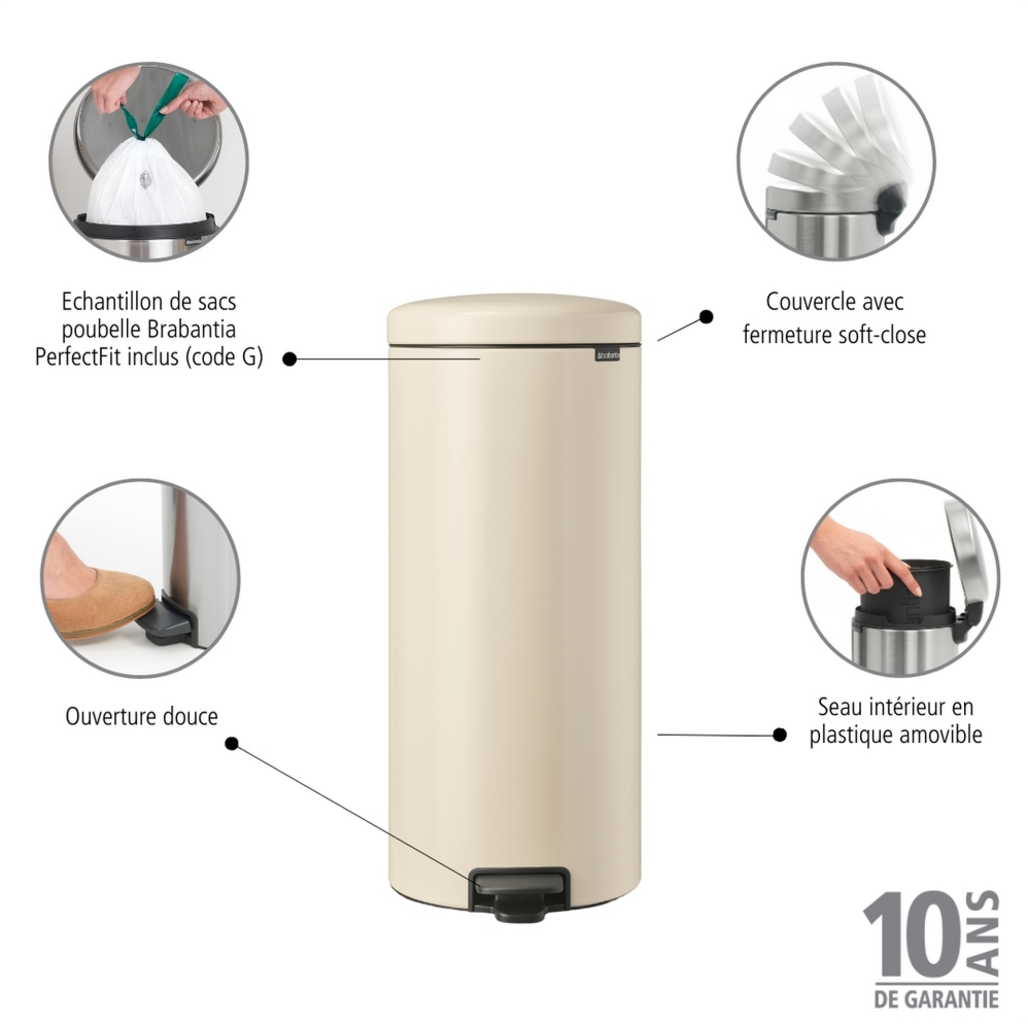- Zawiera próbkę naszych worków na śmieci Brabantia PerfectFit (Code G) - łatwe i niewidoczne mocowanie bez brzydkich krawędzi worków na śmieci.