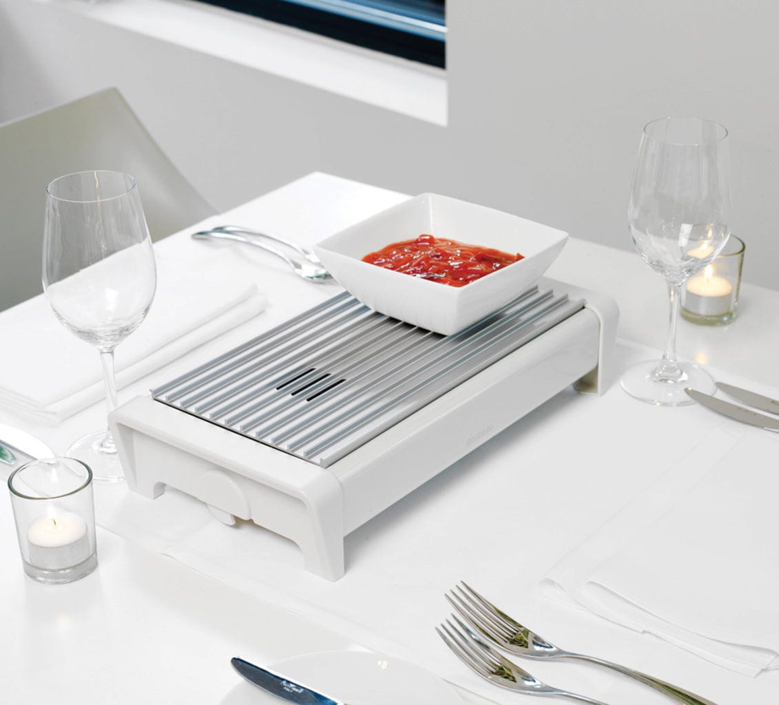 Podgrzewacz utrzymuje naczynia lub jedzenie w cieple. Dzięki dwuściennym świecznikom twój stół jest chroniony przed śladami po płomieniach. Uchwyty po bokach nie nagrzewają się, dzięki czemu można łatwo podnieść podgrzewacz.