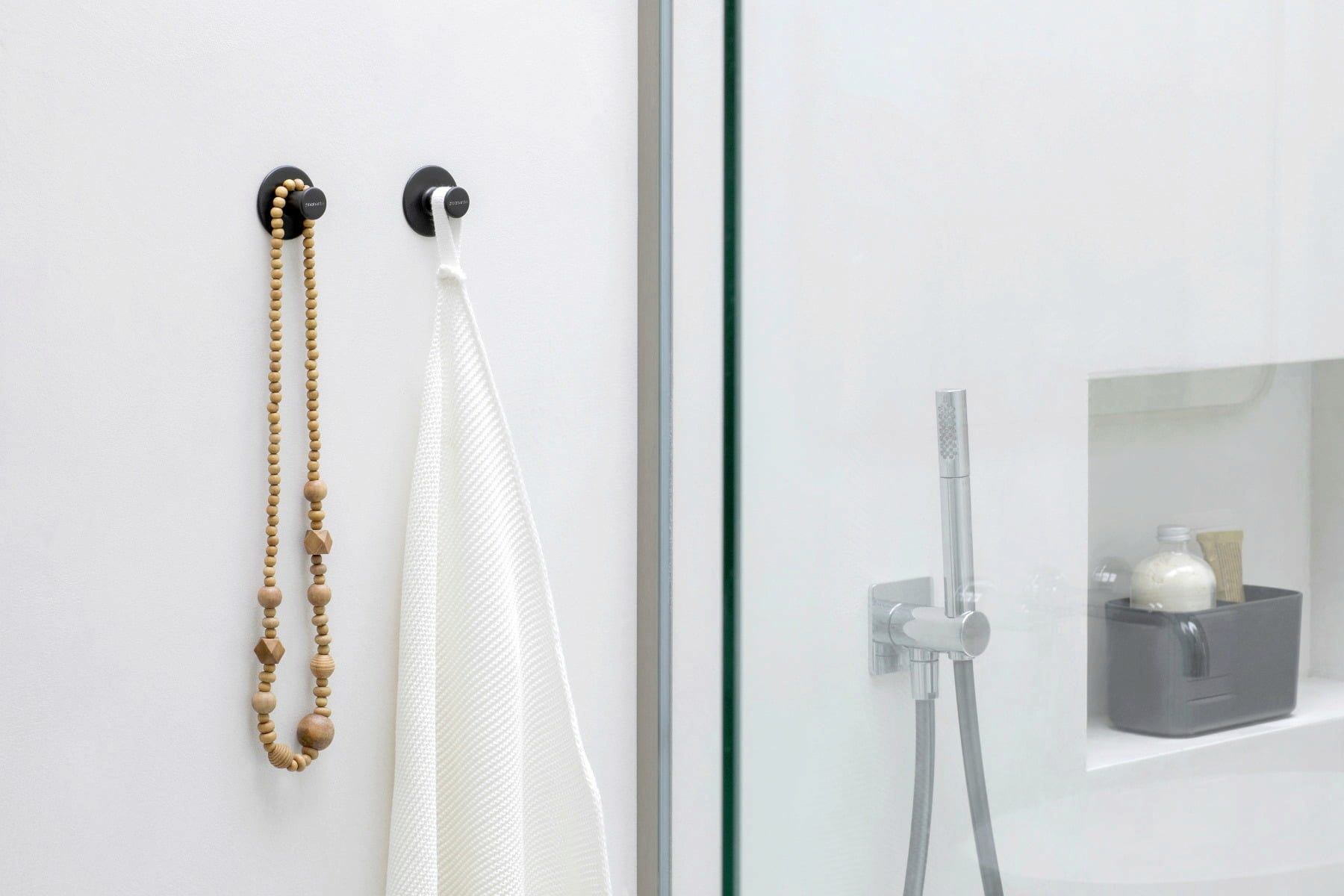 Zawieś swój ręcznik w dowolnym miejscu dzięki tym haczykom. Montaż na ścianie jest łatwy dzięki dołączonym śrubom. Jeśli jednak nie masz ochoty na wiercenie, możesz po prostu przymocować haczyki za pomocą dołączonej taśmy samoprzylepnej. Ty decydujesz!