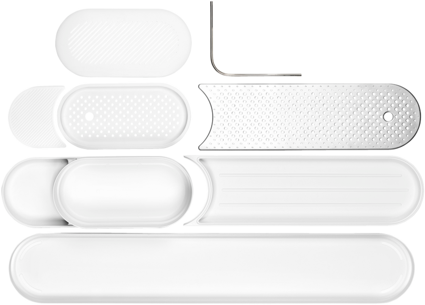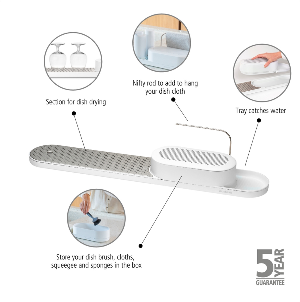 Ten stylowy i sprytny organizer do zlewu utrzymuje powierzchnię roboczą zawsze schludną i czystą. Zestaw, który składa się z suszarki, pojemnika do przechowywania i uchwytu na ściereczki, dzięki modułowej konstrukcji może być używany na wiele sposobów i oferuje wystarczająco dużo miejsca do przechowywania gąbek, ściereczek, szczotek do mycia naczyń i innych. Suszarka z pokrywą ze stali nierdzewnej idealnie nadaje się do szklanek, a jej rowkowana podstawa zapewnia bezpieczne trzymanie desek do krojenia i tym podobnych.
