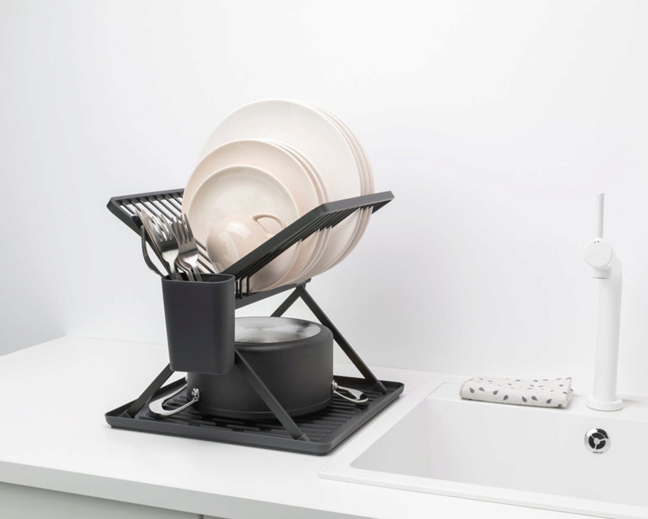 Ten składany aluminiowy stojak z ociekaczem zachwyca nie tylko oszczędnością miejsca i stylowym wyglądem, ale przede wszystkim praktycznymi funkcjami. Można go szybko i łatwo złożyć, kompaktowo schować i oferuje miejsce na maksymalnie 13 talerzy, a także sztućce i inne przybory, które można przechowywać w wyjmowanym koszyku na sztućce. Garnki i patelnie również czują się tu jak w domu.