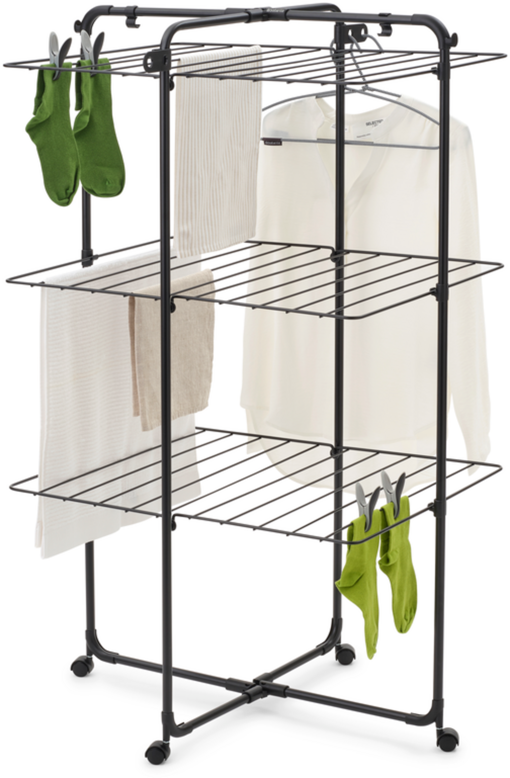 Suszarka wieżowa HangOn o długości suszenia 23 metrów jest idealnym codziennym pomocnikiem, jeśli chcesz suszyć dużo prania w sposób oszczędzający miejsce. Trzy elastycznie składane i rozkładane półki oferują wystarczająco dużo miejsca na małe i duże rzeczy do prania - od koszul po ręczniki. Dzięki czterem kółkom, wieszak na ubrania można bez wysiłku obrócić i wsunąć w dowolny kąt.