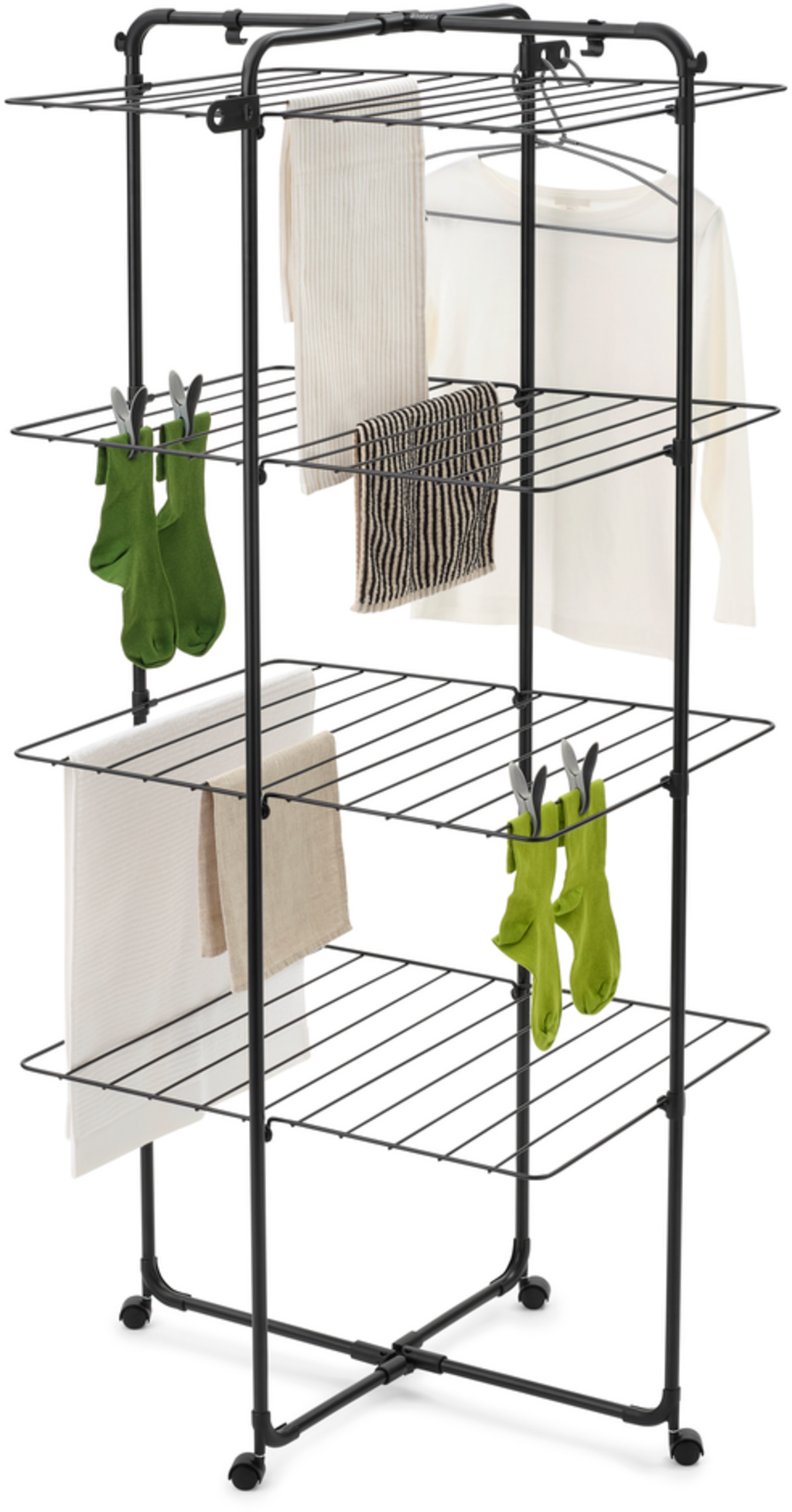 Suszarka wieżowa HangOn zapewnia dużo miejsca do suszenia na niewielkiej powierzchni. Dzięki pojemności 30 metrów idealnie nadaje się do dużych ilości prania - a dzięki sprytnej, zwijanej konstrukcji można ją łatwo wsunąć w każdy kąt. Solidna stalowa rama sprawia, że suszarka jest trwałym, stylowym pomocnikiem, który idealnie pasuje do kuchni, łazienki, sypialni lub salonu.