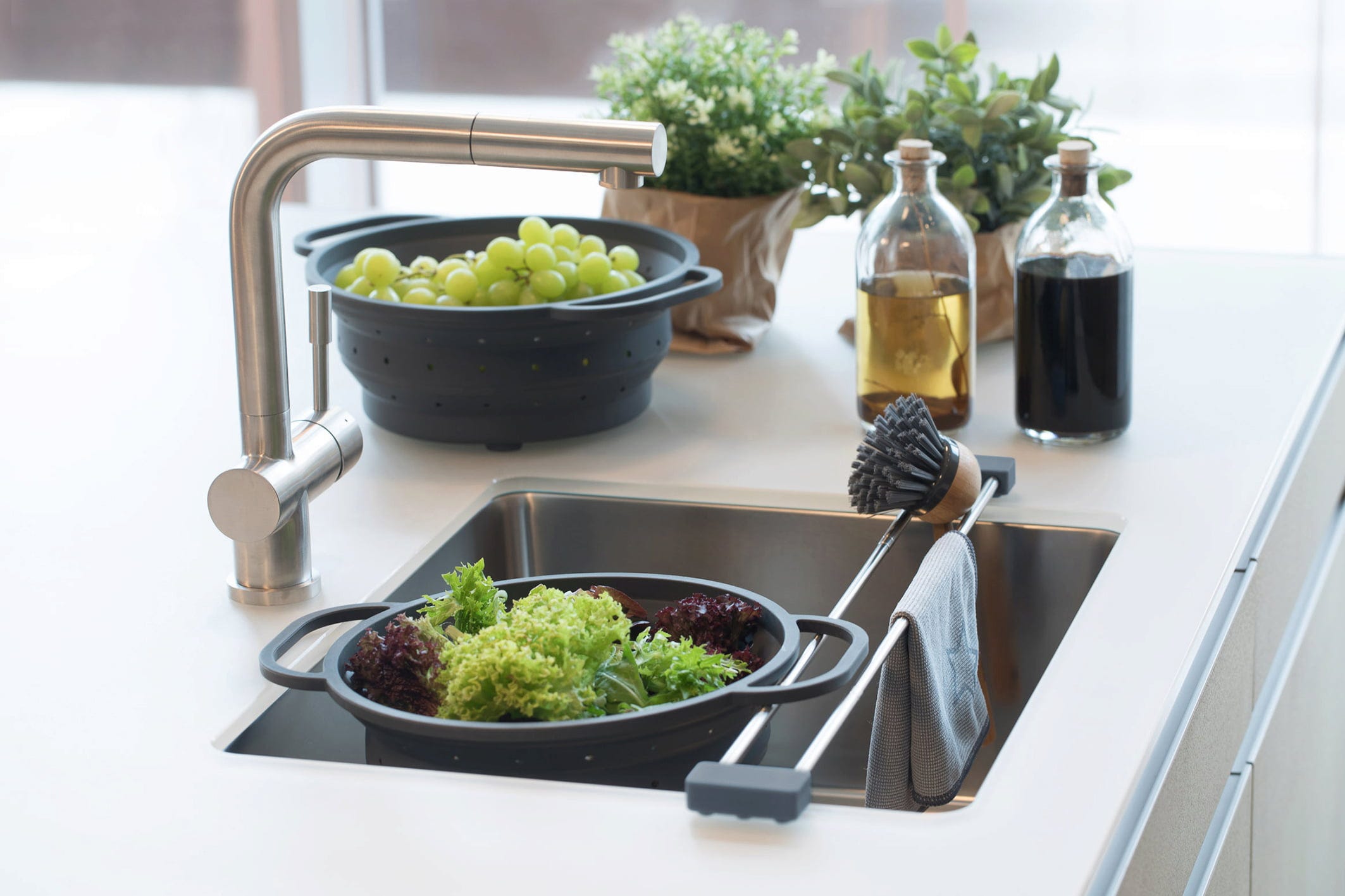 Pożegnaj wilgotne ściereczki i niehigieniczne siedliska bakterii przy zlewie. Dzięki drip.line w mgnieniu oka stworzysz czyste miejsce na gąbki, szczotki i ściereczki, aby mogły optymalnie schnąć na powietrzu. Listwa jest elastycznie rozciągana i dopasowuje się indywidualnie do niemal każdego zlewu.