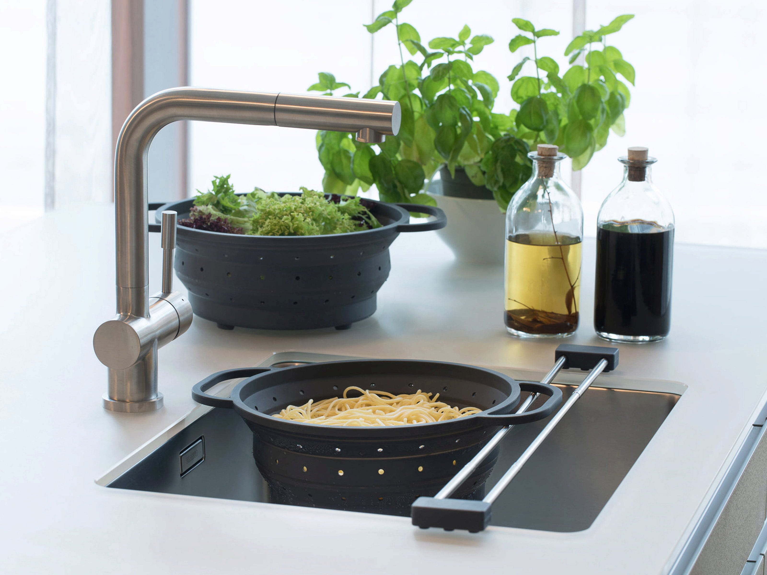 Pożegnaj nieporęczne akcesoria kuchenne, które zajmują miejsce w szufladach. Dzięki sieb.up zyskujesz w kuchni prawdziwy cud oszczędzania przestrzeni, który po użyciu można złożyć do płaskiej formy o wysokości zaledwie 3 cm. Pomimo kompaktowego rozmiaru to silikonowe sito jest wyjątkowo wytrzymałe i doskonale sprawdza się przy odcedzaniu makaronu, myciu sałaty, a nawet gotowaniu warzyw na parze.