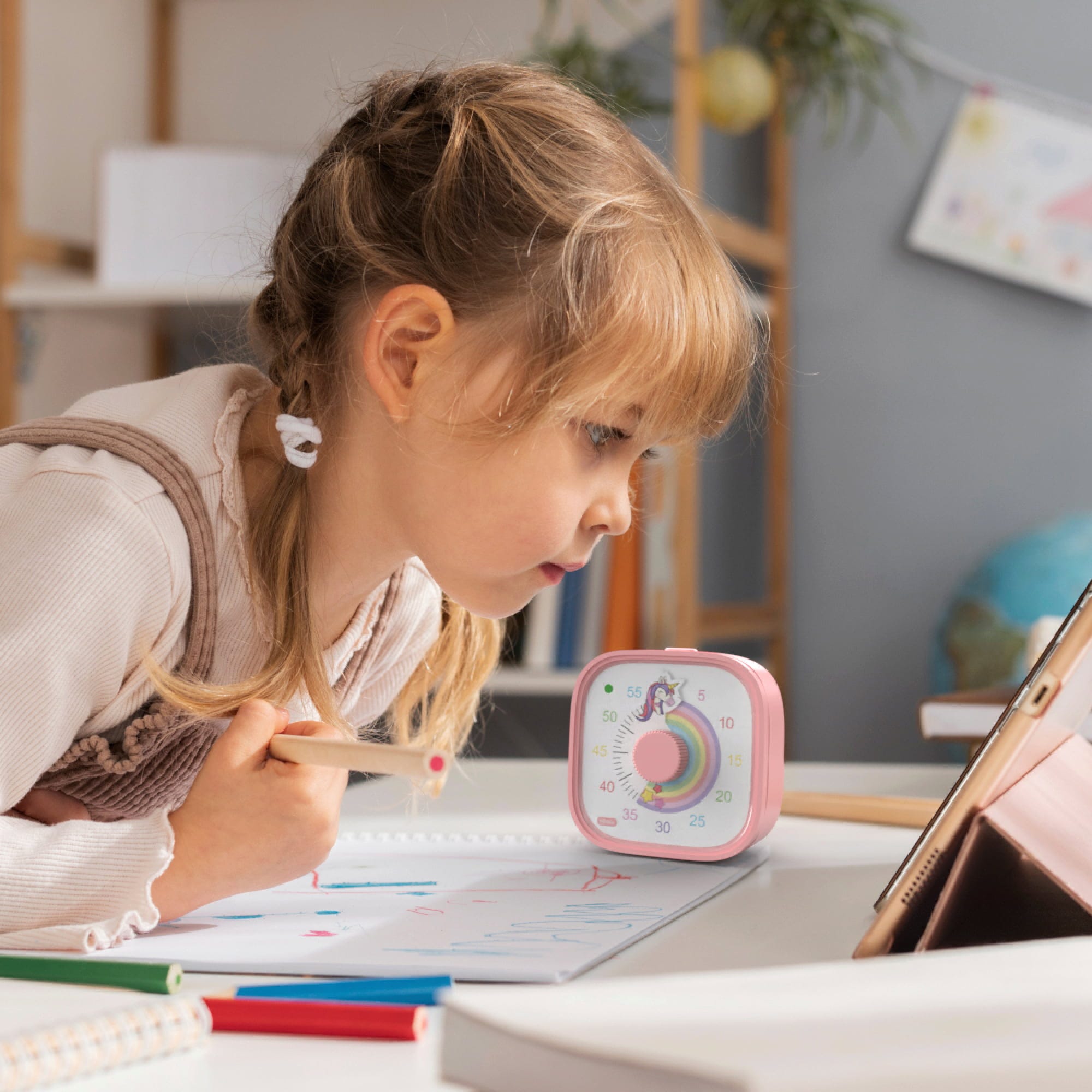 Uczyń zarządzanie czasem dziecinnie prostym i wprowadź więcej struktury do codzienności. Dzięki Visual Timer abstrakcyjne pojęcie czasu staje się wreszcie namacalne: wystarczy przekręcić pokrętło, aby ustawić wybrany czas do 60 minut. Kolorowa tarcza stopniowo znika wraz z upływem czasu, dzięki czemu zarówno dzieci, jak i dorośli mogą od razu zobaczyć, ile czasu pozostało na odrabianie lekcji, przerwy na zabawę czy czas przed ekranem.