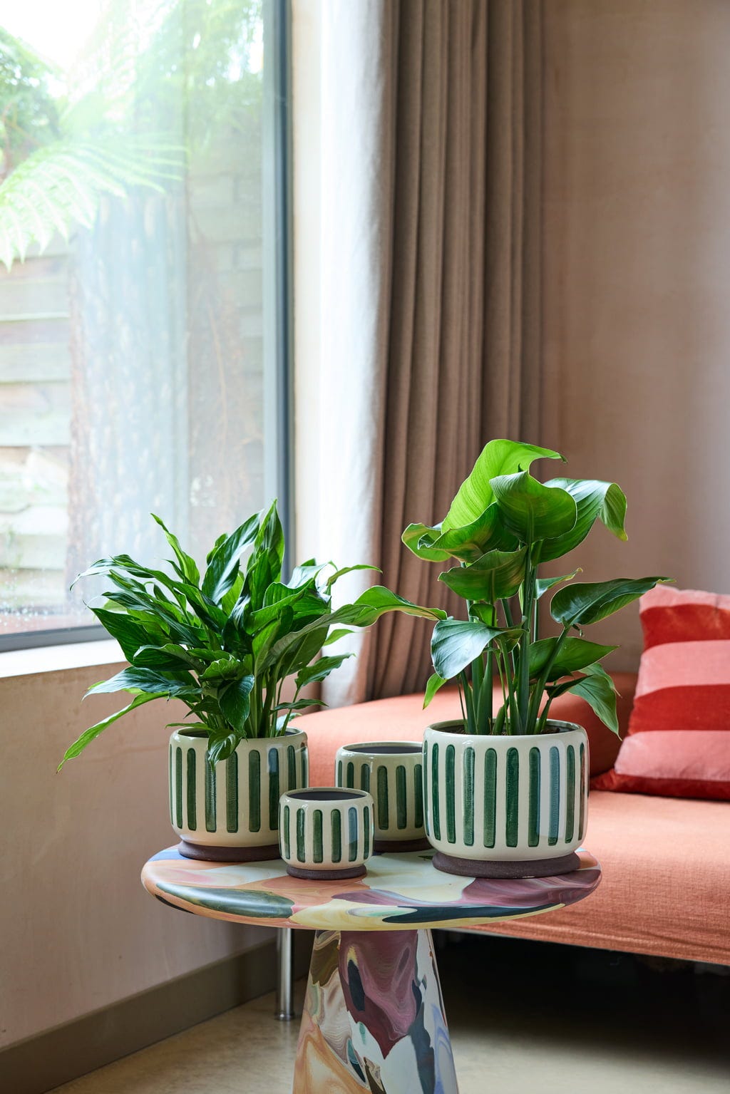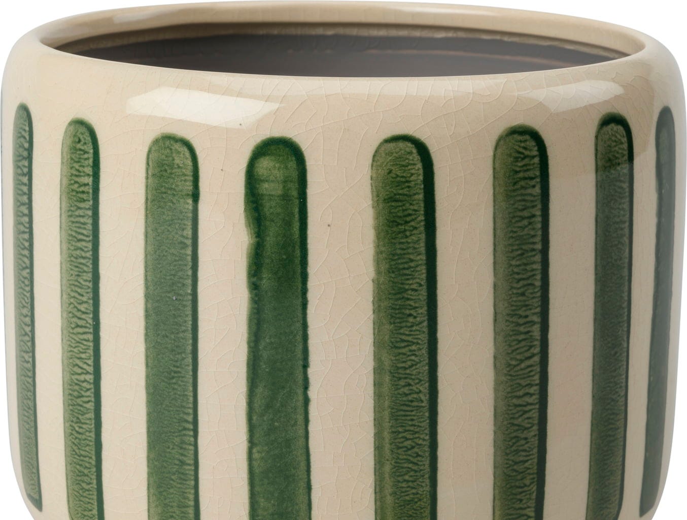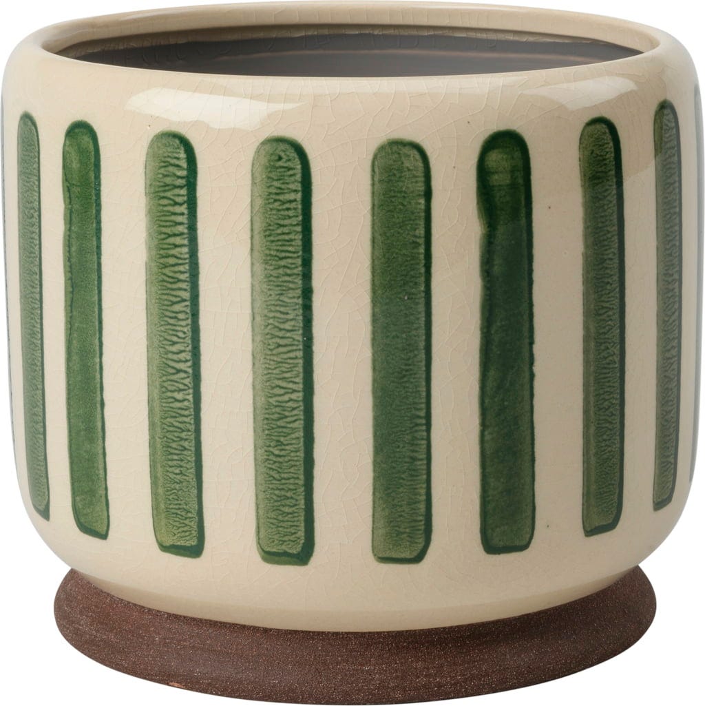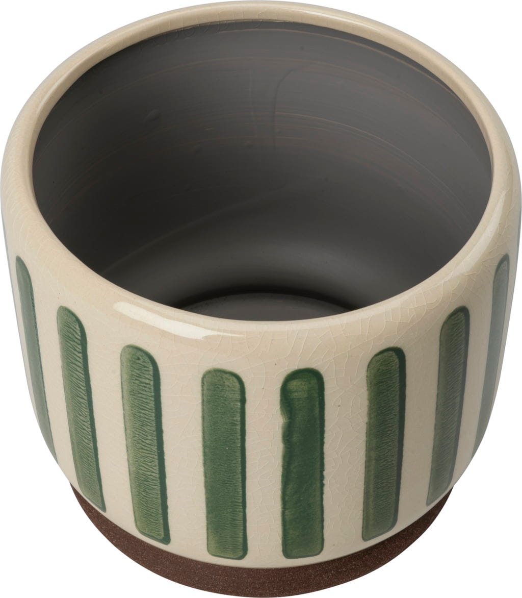 Nadaj swojemu domowi świeży, nowoczesny wygląd dzięki stylowej glinianej doniczce "Collector". Delikatne spękane szkliwo w połączeniu z efektownymi paskami sprawia, że ta doniczka przyciąga wzrok, wprowadzając do pomieszczeń zarówno kolor, jak i teksturę.