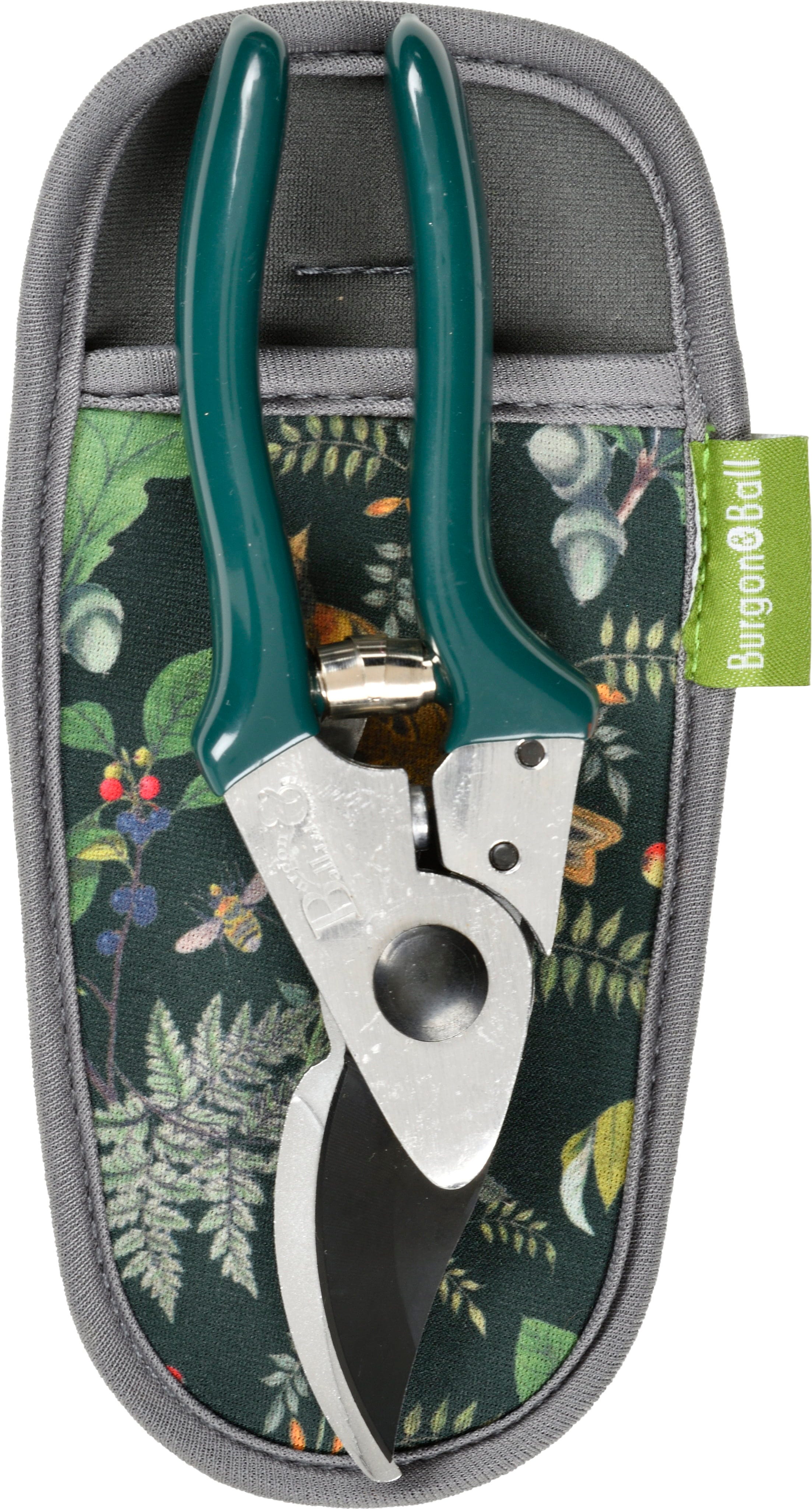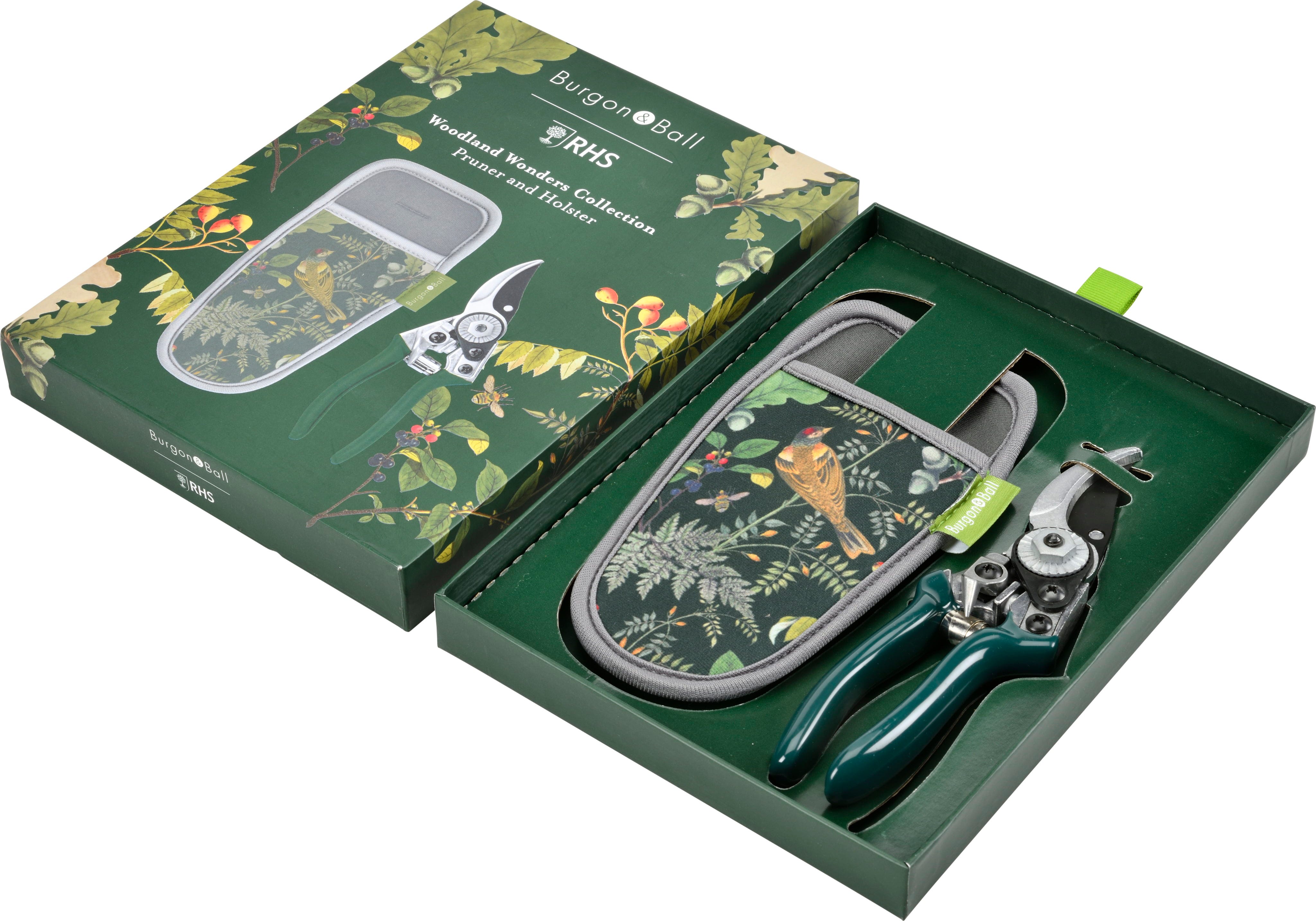 Aby sekator był zawsze pod ręką podczas pracy w ogrodzie, w zestawie znajduje się dopasowane neoprenowe etui, które można wygodnie przymocować do paska. Design zachwyca historycznymi ilustracjami z archiwów RHS, które na głębokozielonym tle oddają spokojną atmosferę leśnej przyrody.