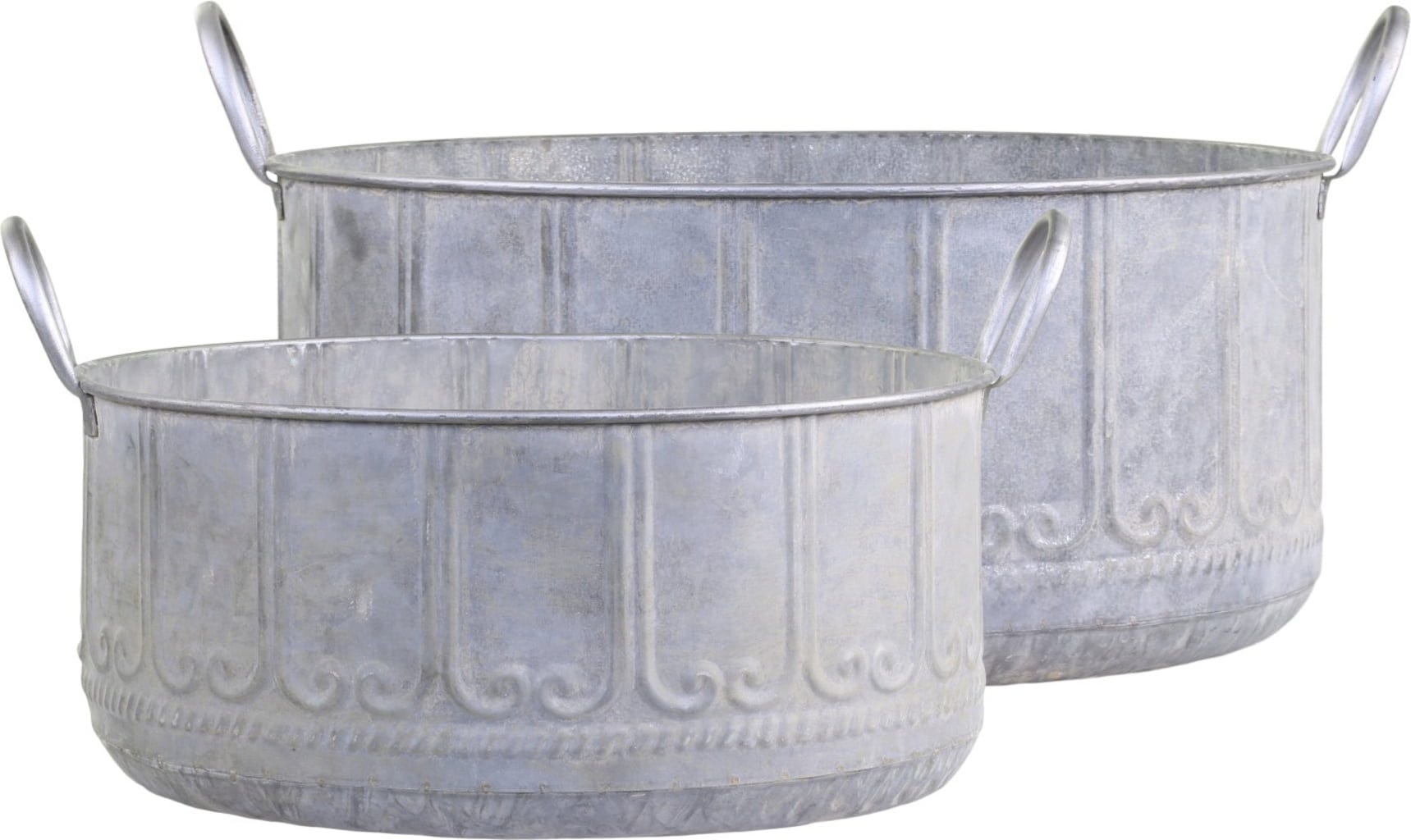 Te wszechstronne misy w zestawie składającym się z 2 sztuk są idealnym dodatkiem do wystroju inspirowanego stylem vintage. Wykonane zostały z wytrzymałego cynku i przyciągają wzrok w każdym miejscu. Użyj ich jako donic do ulubionych kwiatów lub jako elementów dekoracyjnych na balkonach i tarasach. Praktyczne uchwyty po bokach ułatwiają transport i pozwalają elastycznie ustawiać te pojemniki.