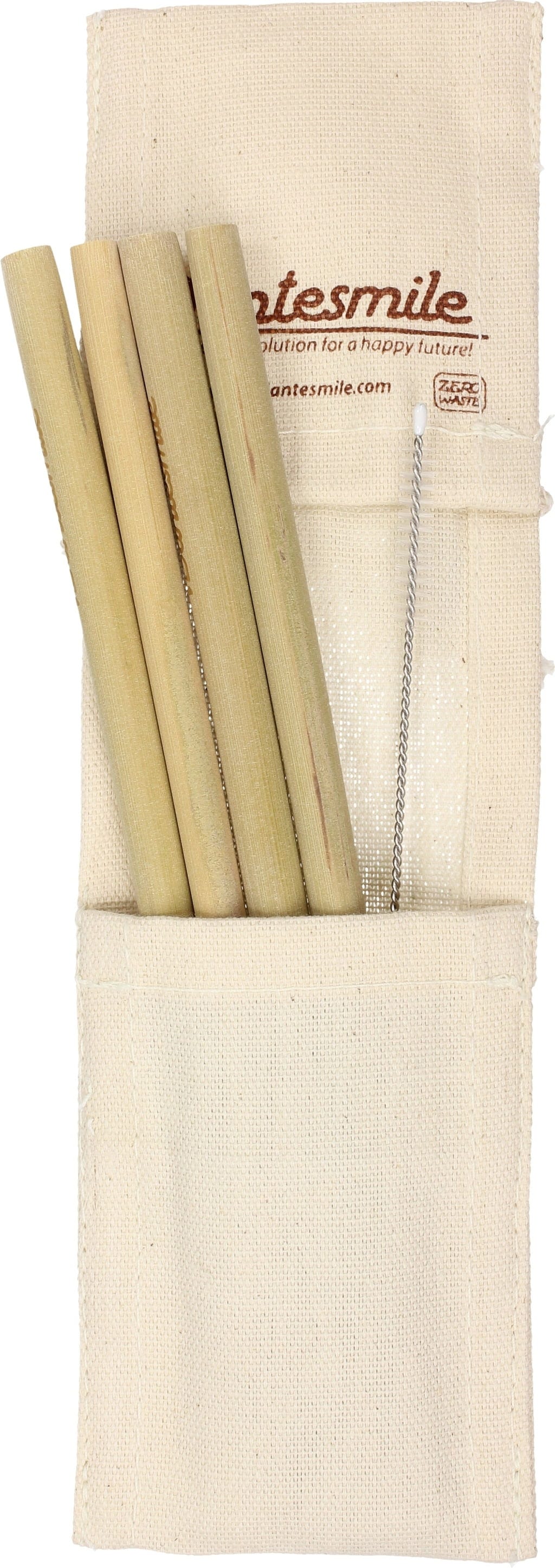 Zawartość zestawu: 4 bambusowe słomki do picia, 1 szczotka do czyszczenia, 1 torba do przechowywania wykonana z bawełny organicznej
