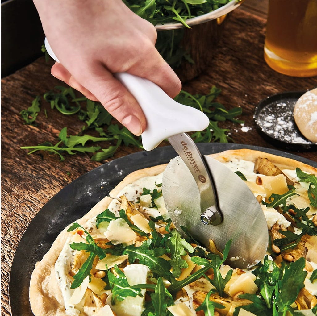 Zawiera nie tylko dwa perforowane sita do pizzy (Ø 28 cm), ale także dwie okrągłe stalowe tacki (Ø 28 cm)! W zestawie znajduje się również elastyczna skrobaczka do ciasta i nóż do pizzy z ostrzem ze stali nierdzewnej.