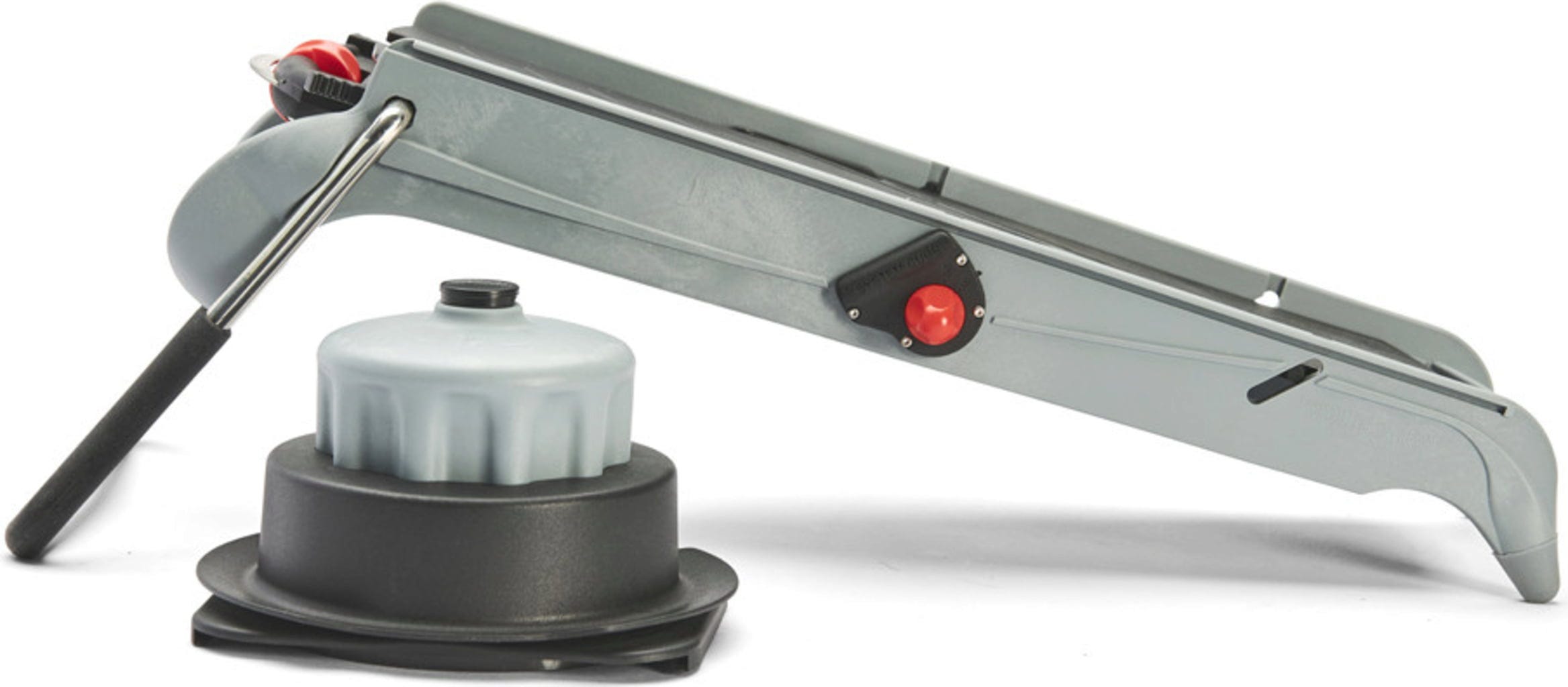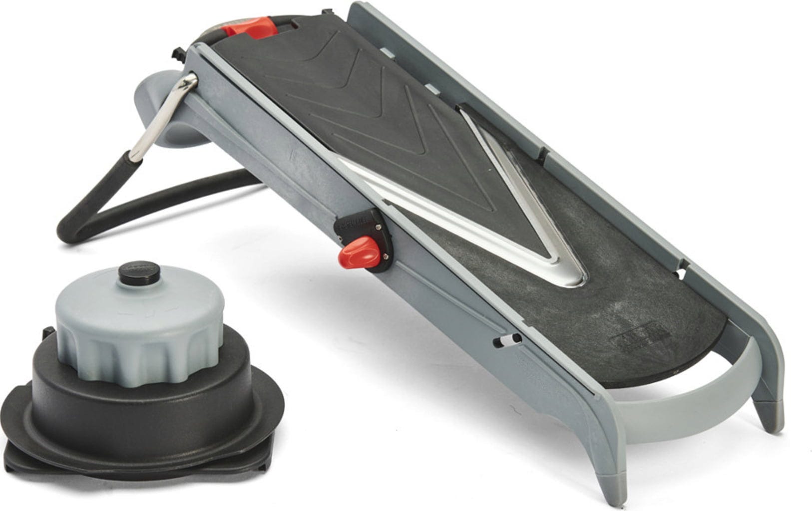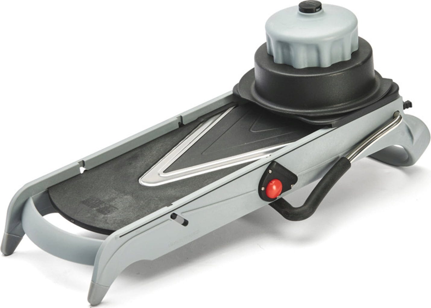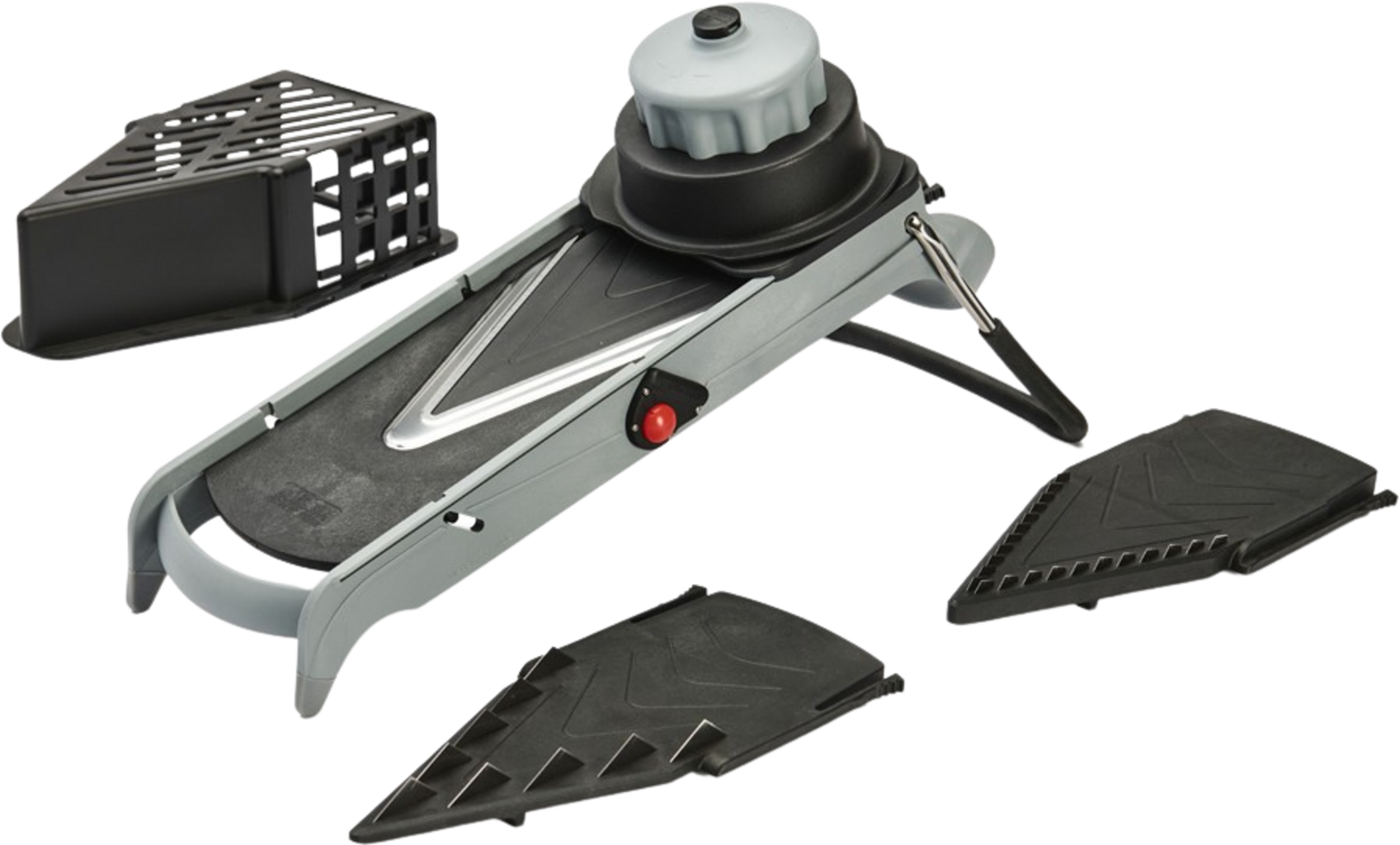 Szczególną atrakcją jest zintegrowany mechanizm cube system, który umożliwia łatwe wkładanie za pomocą jednego przycisku. Za pomocą płynnie poruszającego się pokrętła można łatwo ustawić żądaną grubość cięcia w zakresie od 1 do 8 mm. Podczas krojenia owoce i warzywa są bezpieczne w praktycznej prowadnicy. Aby zapobiec ślizganiu się krajalnicy w czasie pracy, antypoślizgowe nóżki zapewniają stabilność. Po skończonej pracy możesz po prostu złożyć nóżki i schować narzędzie, oszczędzając w ten sposób miejsce!