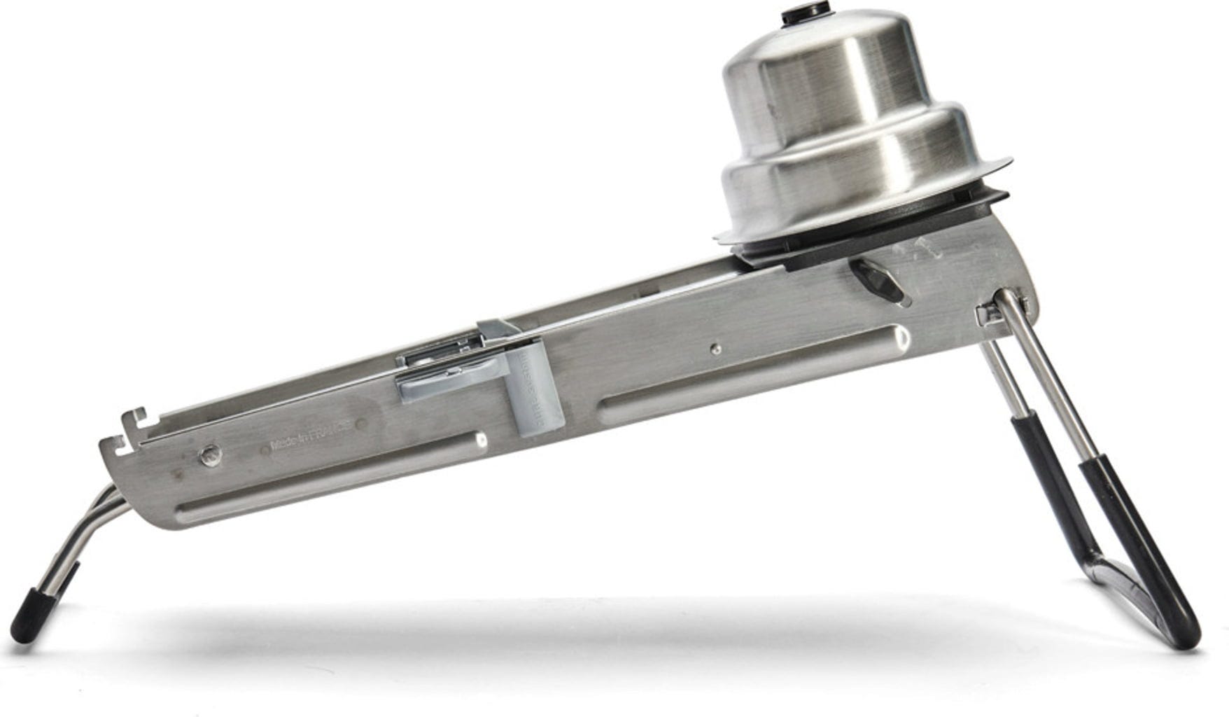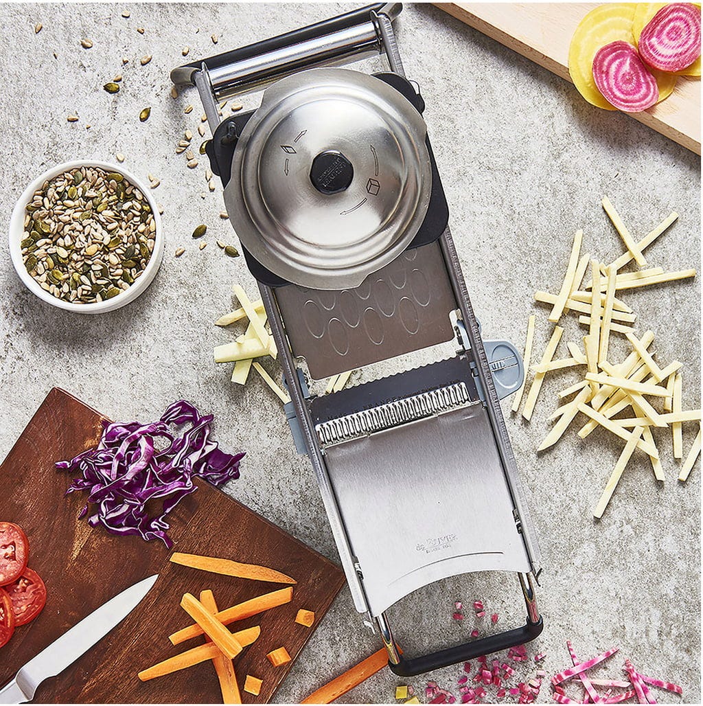 Prowadnica i okrągły suwak wykonane ze szczotkowanej stali nierdzewnej z systemem kontroli obrotów umożliwiają łatwe i równomierne cięcie. Dzięki temu wszechstronnemu pomocnikowi Twoja kreatywność w kuchni nie będzie miała żadnych ograniczeń!