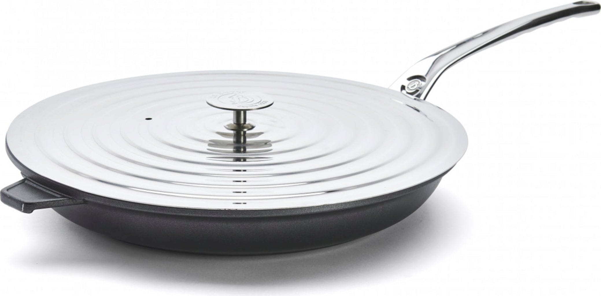Ta płaska, uniwersalna pokrywka pasuje do wszystkich patelni. Wykonana ze stali nierdzewnej, jest zarówno solidna, jak i przyjemnie łatwa w użyciu. Eleganckie pokrętło ze stali nierdzewnej De Buyer wygodnie leży w dłoni i ułatwia zakładanie i zdejmowanie.