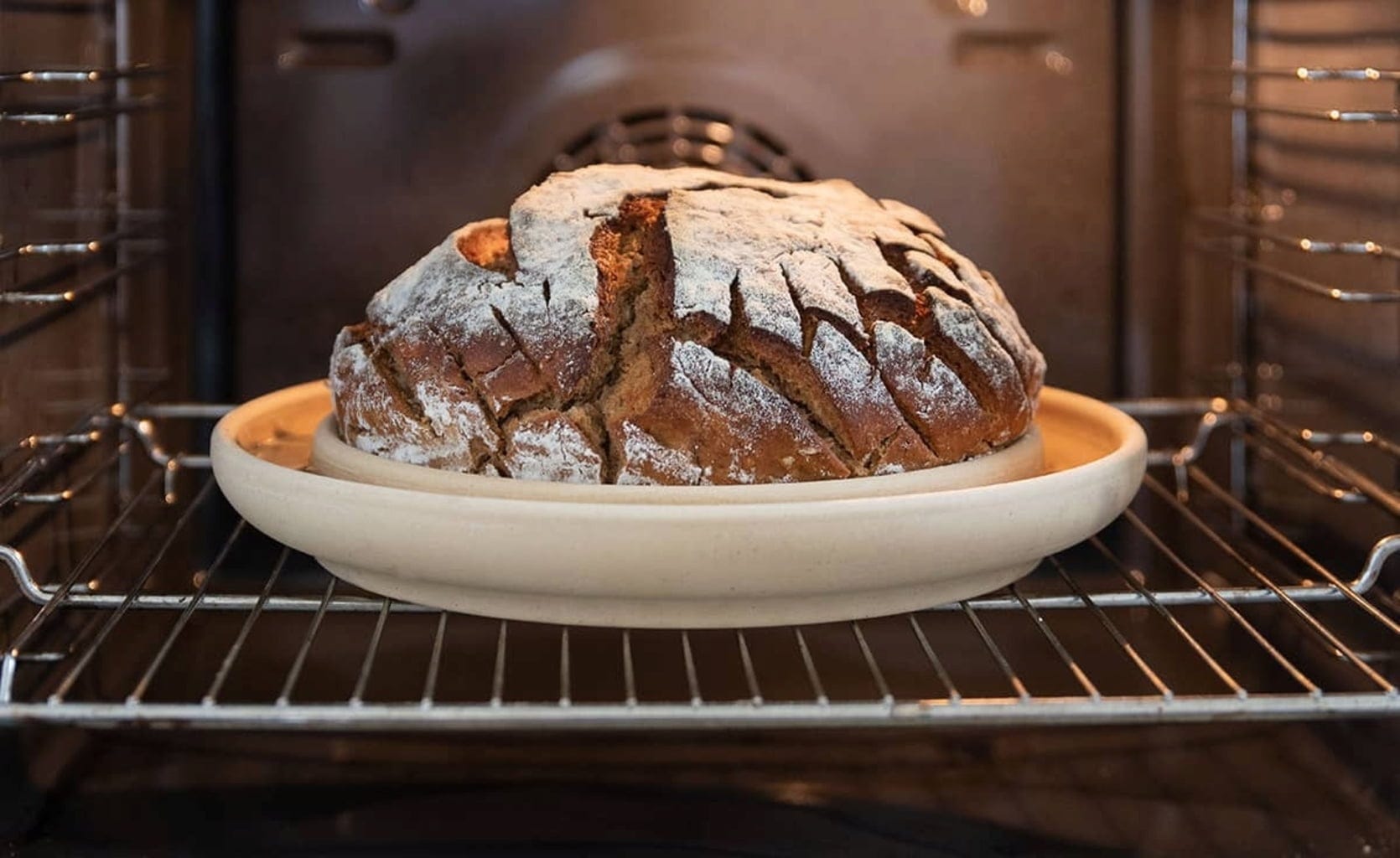 - Ceramika gromadząca ciepło i ukierunkowane odparowanie wody zapewniają optymalne rezultaty pieczenia, tak jak w piecu opalanym drewnem