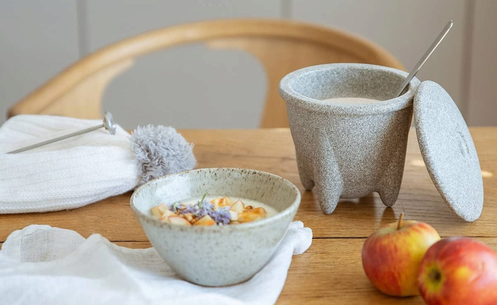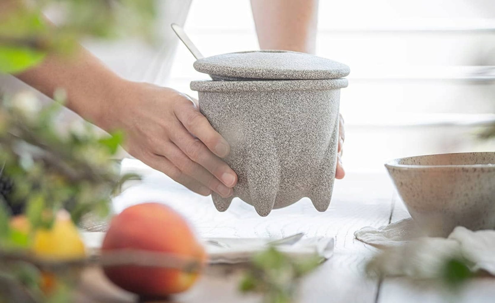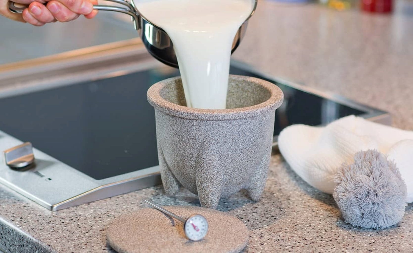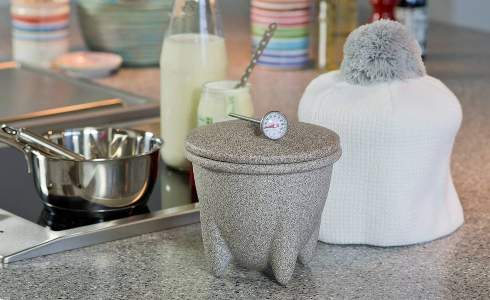 Naczynie do robienia jogurtu DENK wykonane zostało z granitowej ceramiki Granicium®, która ma wysoką zdolność magazynowania ciepła i niską przewodność cieplną oraz zatrzymuje ciepło około 20 razy dłużej niż stal. Stopki i czapka ocieplająca zapewniają również powolne schładzanie mleka, dzięki czemu warunki są idealne do produkcji jogurtu.