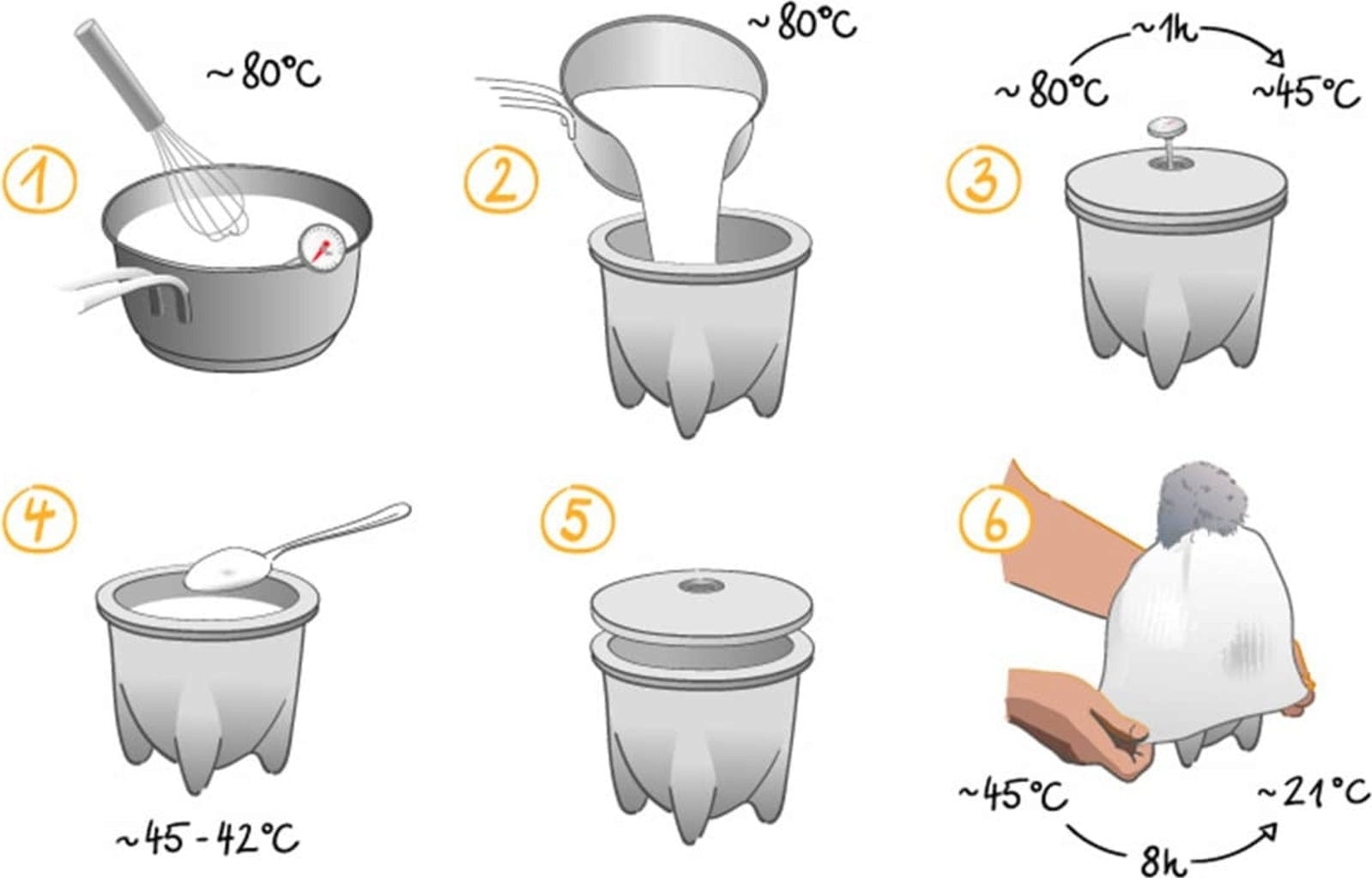Do produkcji jogurtu możesz użyć mleka krowiego, mleka bez laktozy, mleka odtłuszczonego albo mleka sojowego. Krótko podgrzej wybrane mleko do 80°C, a następnie przelej je do naczynia, które należy przykryć oraz położyć na nim termometr. Po około godzinie, gdy mleko ostygnie do 45-42°C, dodaj trzy łyżki jogurtu. Ponownie przykryj, a na naczynie nałóż czapkę utrzymującą ciepło. Aby powstał gotowy, domowy jogurt potrzeba ok. 8 godzin.