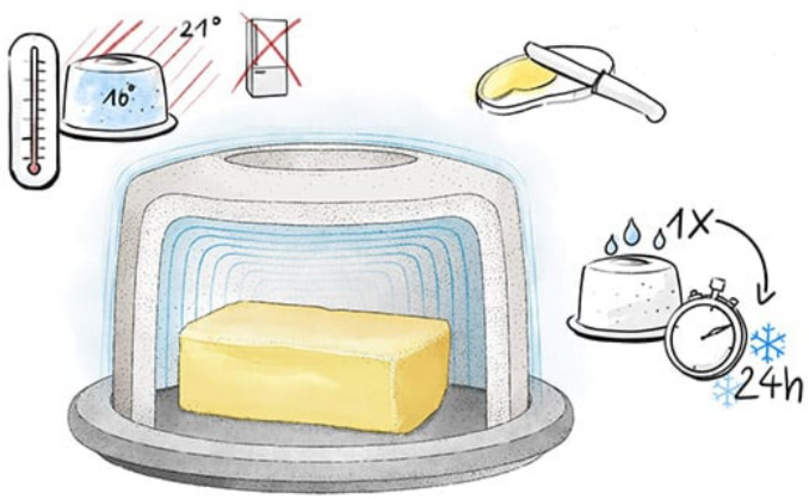 Wykonana z wysokiej jakości ceramiki, dwuczęściowa maselniczka chłodząca wykorzystuje zasadę chłodzenia wyparnego, aby zapewnić masło łatwe do rozsmarowywania przez cały czas - bez potrzeby korzystania z lodówki.