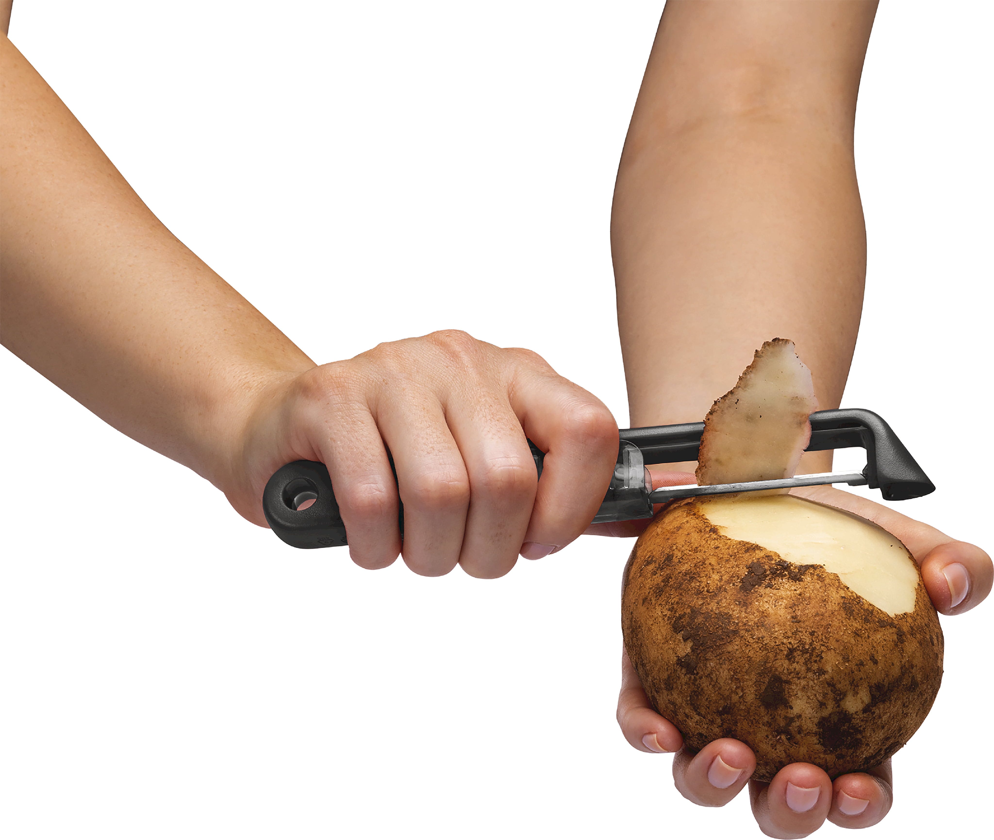 Obieraczka Sharple firmy Dreamfarm jest wyposażona w ostre jak brzytwa ostrze wykonane z japońskiej stali nierdzewnej, które dzięki obrotowemu zawieszeniu wytwarza wyjątkowo mało odpadów. Absolutną atrakcją jest innowacyjna osłona bezpieczeństwa: za każdym razem, gdy otwierasz lub zamykasz osłonę, wbudowana ceramiczna ostrzałka kulkowa automatycznie ostrzy ostrze. Pozwala to na bezproblemowe usuwanie skórek z owoców i warzyw przy każdym użyciu, a zintegrowana ostrzałka do ziemniaków usuwa nieestetyczne plamy w mgnieniu oka. Niezależnie od tego, czy jest to osoba prawo- czy leworęczna, ten ergonomiczny pomocnik doskonale leży w dłoni, a po użyciu można go łatwo umyć w zmywarce.