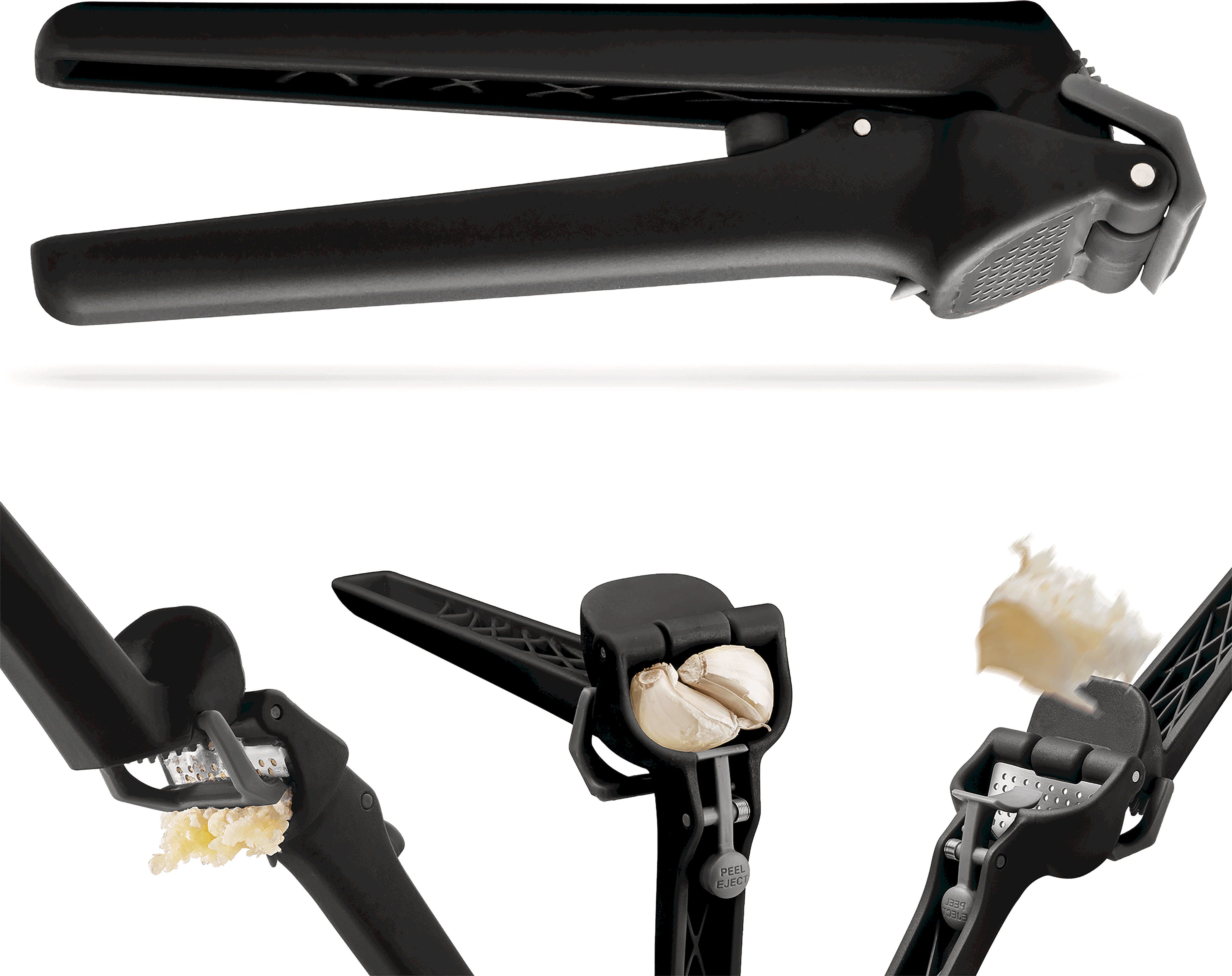 Podczas otwierania automatyczny skrobak usuwa wszystkie pozostałości po wyciskaniu z wnętrza, a sprytny przycisk "Peel Eject" z łatwością wyrzuca skórki. Nie pozostawia to nieprzyjemnego zapachu na dłoniach, a wyciskarka jest gotowa do ponownego użycia natychmiast po szybkim wypłukaniu!
