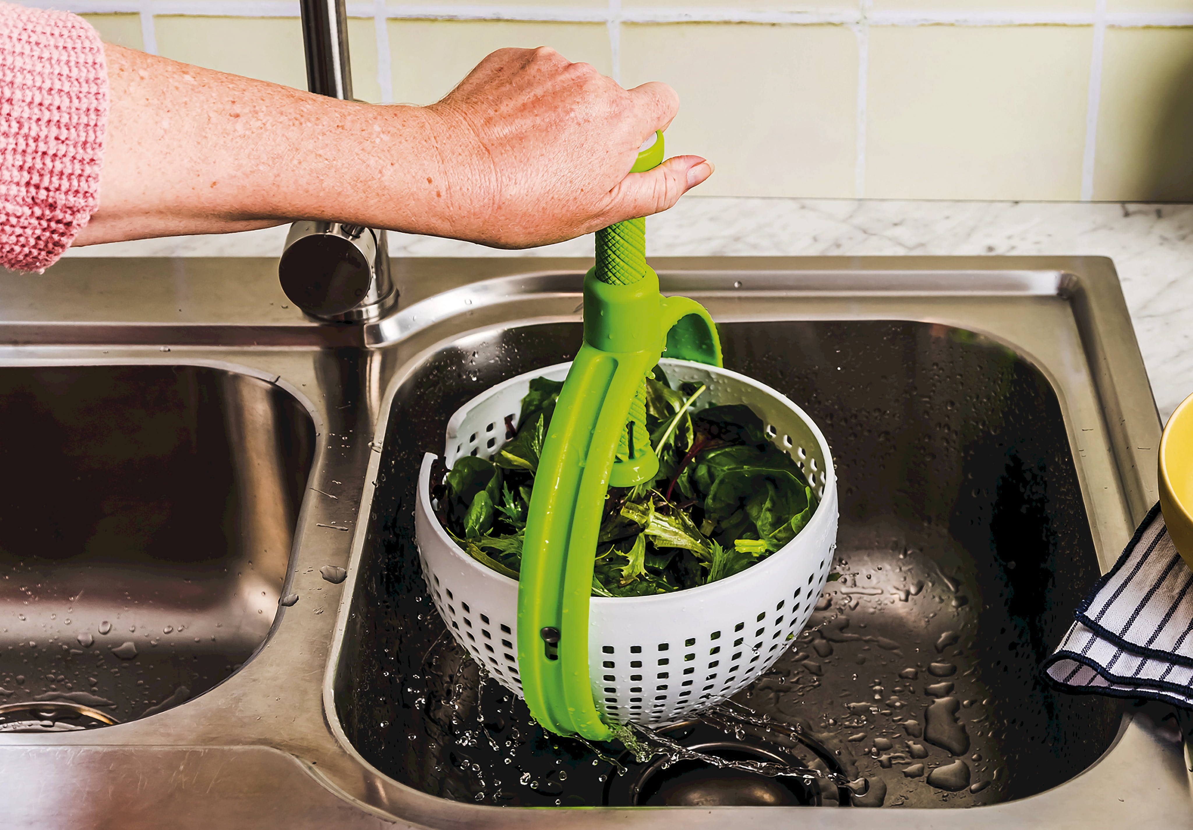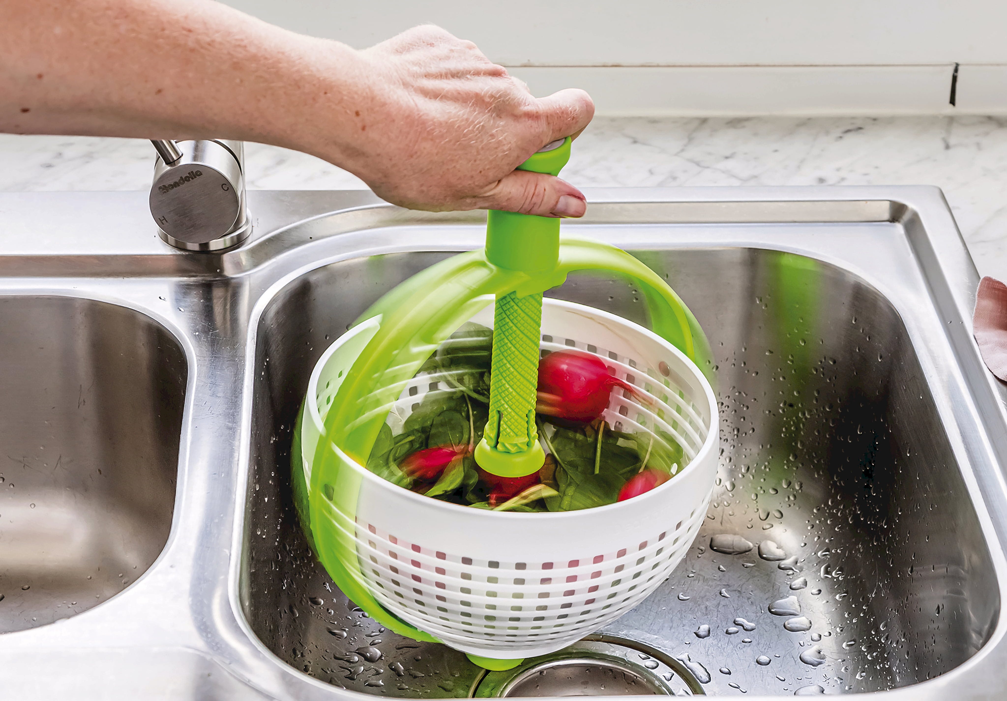 Wirówka do sałaty Spina od Dreamfarm to pomysłowe urządzenie 2 w 1, które doskonale łączy w sobie funkcję durszlaka i suszarki. Dzięki antypoślizgowej podstawie można wirować sałatkę, warzywa lub owoce bezpośrednio w zlewie z najwyższą prędkością, a wystające boki gwarantują, że zawartość pozostanie w misce.