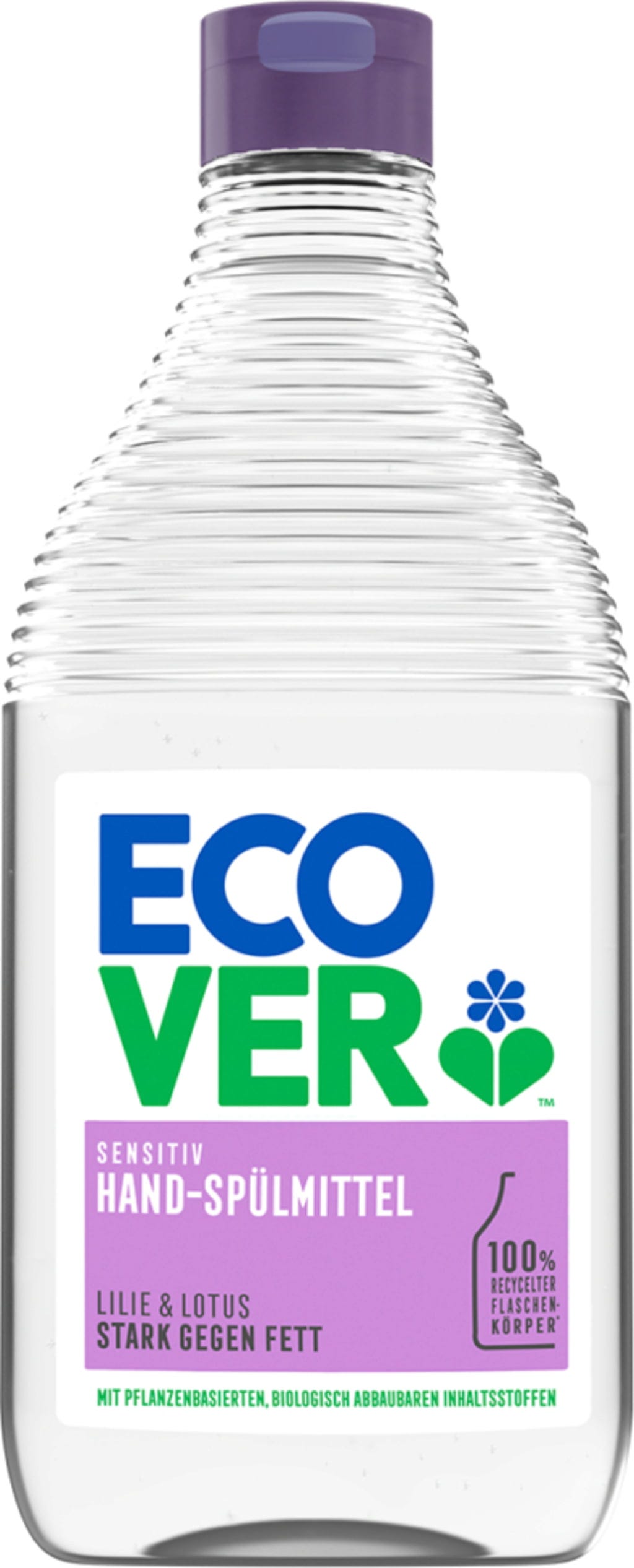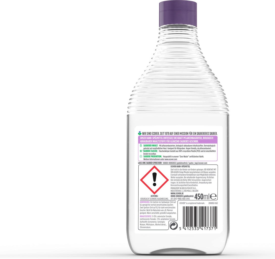 Ten wegański, delikatny płyn do mycia rąk od firmy ecover na bazie mocnych, cukrowych środków powierzchniowo czynnych, zapewnia błyszczące naczynia. Wszystkie składniki (z wyjątkiem minerałów) ulegają biodegradacji. Butelka nadaje się w 100% do recyklingu. Składa się z plastiku (PET) i polipropylenu (PP).