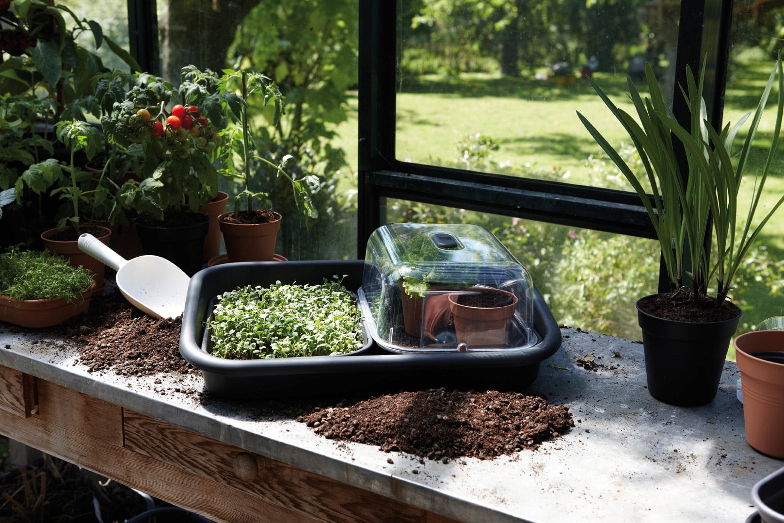 To wielofunkcyjne narzędzie jest nie tylko użytecznym pomocnikiem w ogrodzie, ale także niezastąpionym w mniejszych szklarniach. Można go używać jako praktycznego stołu roboczego i umieszczać na nim małe narzędzia ogrodnicze, nasiona i ziemię doniczkową. Wysoka krawędź tacy niezawodnie zapobiega upadkowi.