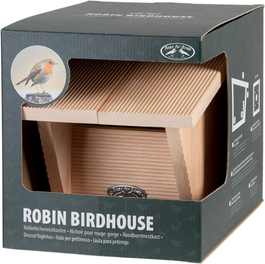 Wykonana z drewna olchowego budka lęgowa jest idealnym miejscem dla rudzików do wychowywania potomstwa i znalezienia bezpiecznego schronienia w zimie. Dzięki spadzistemu dachowi i grubym ścianom budka lęgowa zapewnia doskonałą ochronę przed deszczem, wiatrem i mrozem. Latem otwory wentylacyjne zapobiegają gromadzeniu się ciepła. Pomyślano również o młodych ptakach, ponieważ chropowate boki wewnętrzne i rowki z przodu ułatwiają im wydostanie się z budki.