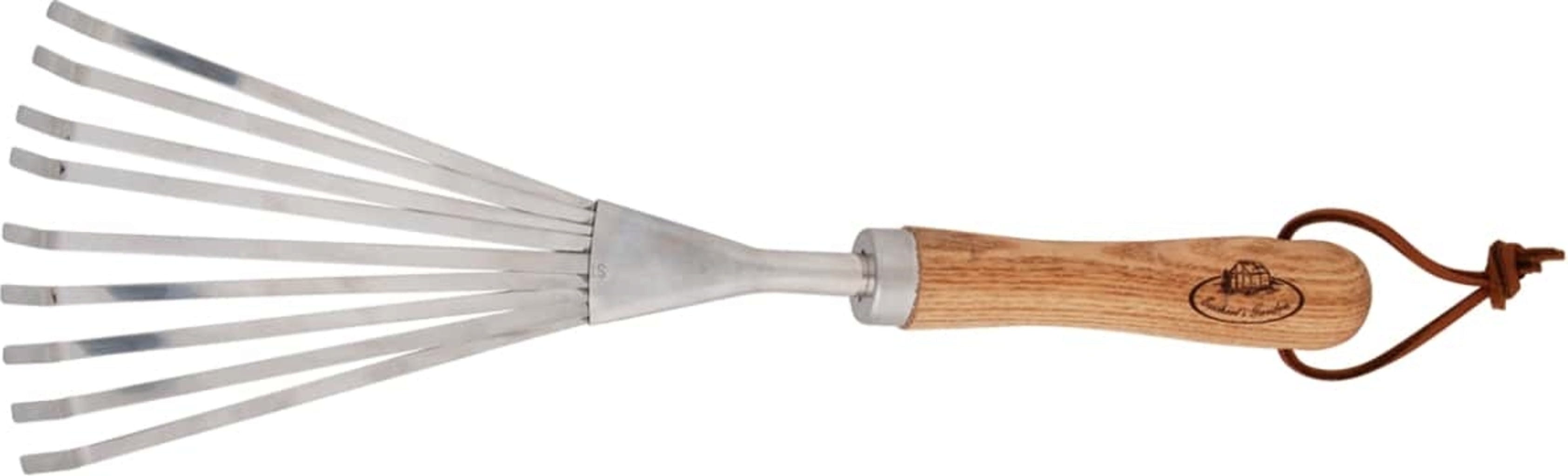 Tradycyjne grabie ręczne wykonane z wysokiej jakości stali nierdzewnej z trzonkiem z drewna jesionowego są idealne do pracy na małych powierzchniach i usuwania liści.