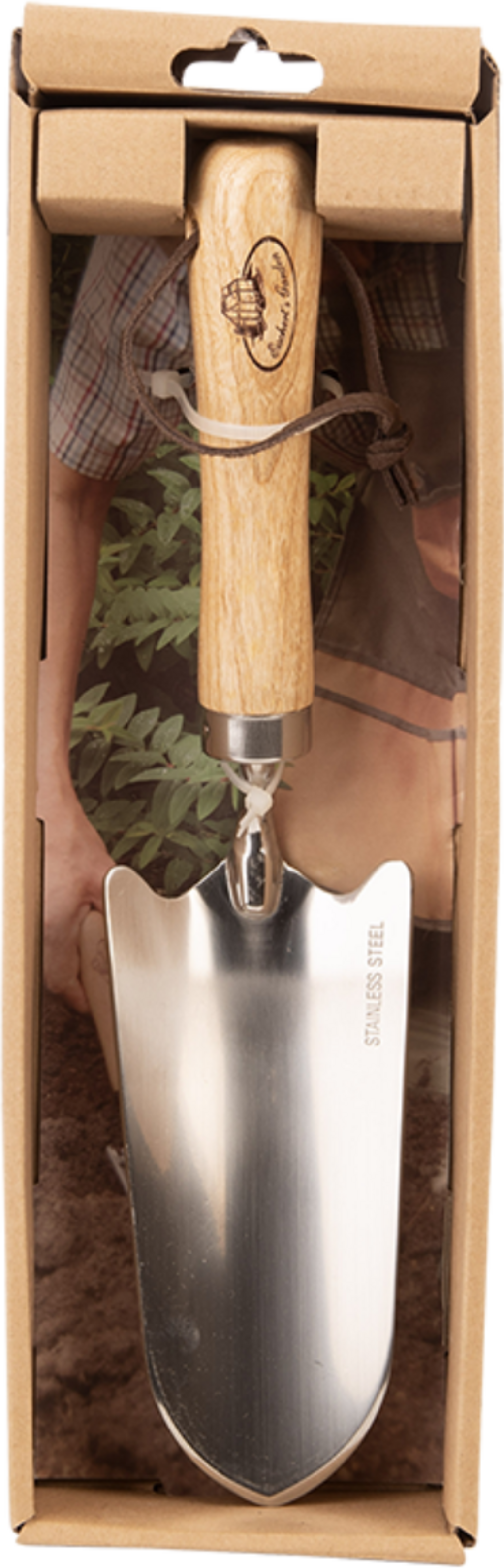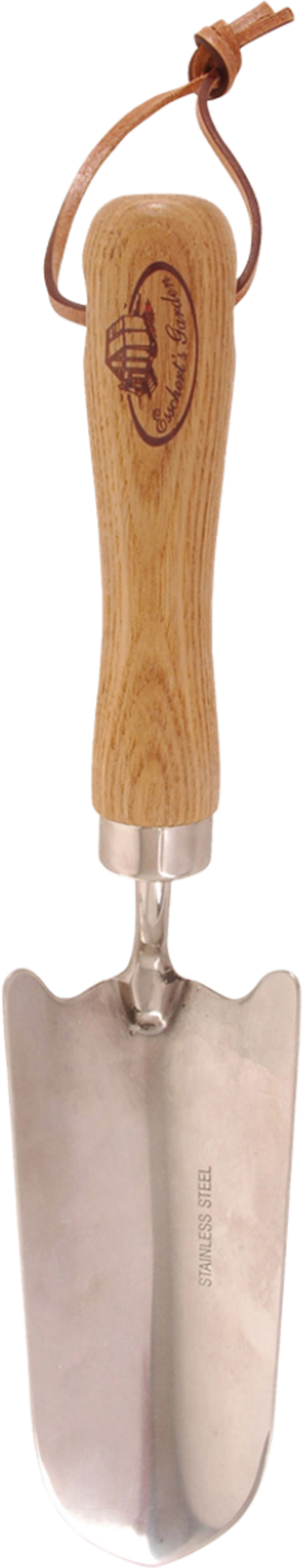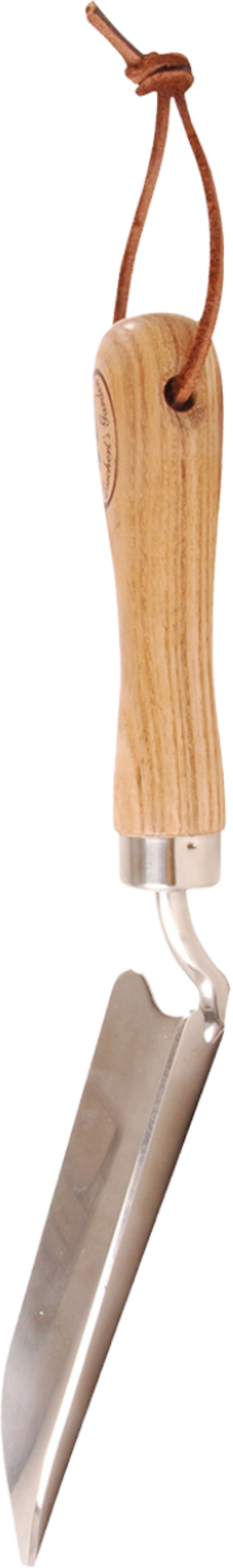Kielnia do kwiatów ze stali nierdzewnej i drewna jesionowego umożliwia szybkie i łatwe przesadzanie kwiatów i usuwanie chwastów. Dzięki skórzanej pętli do zawieszania narzędzie można szybko schować i starannie powiesić.