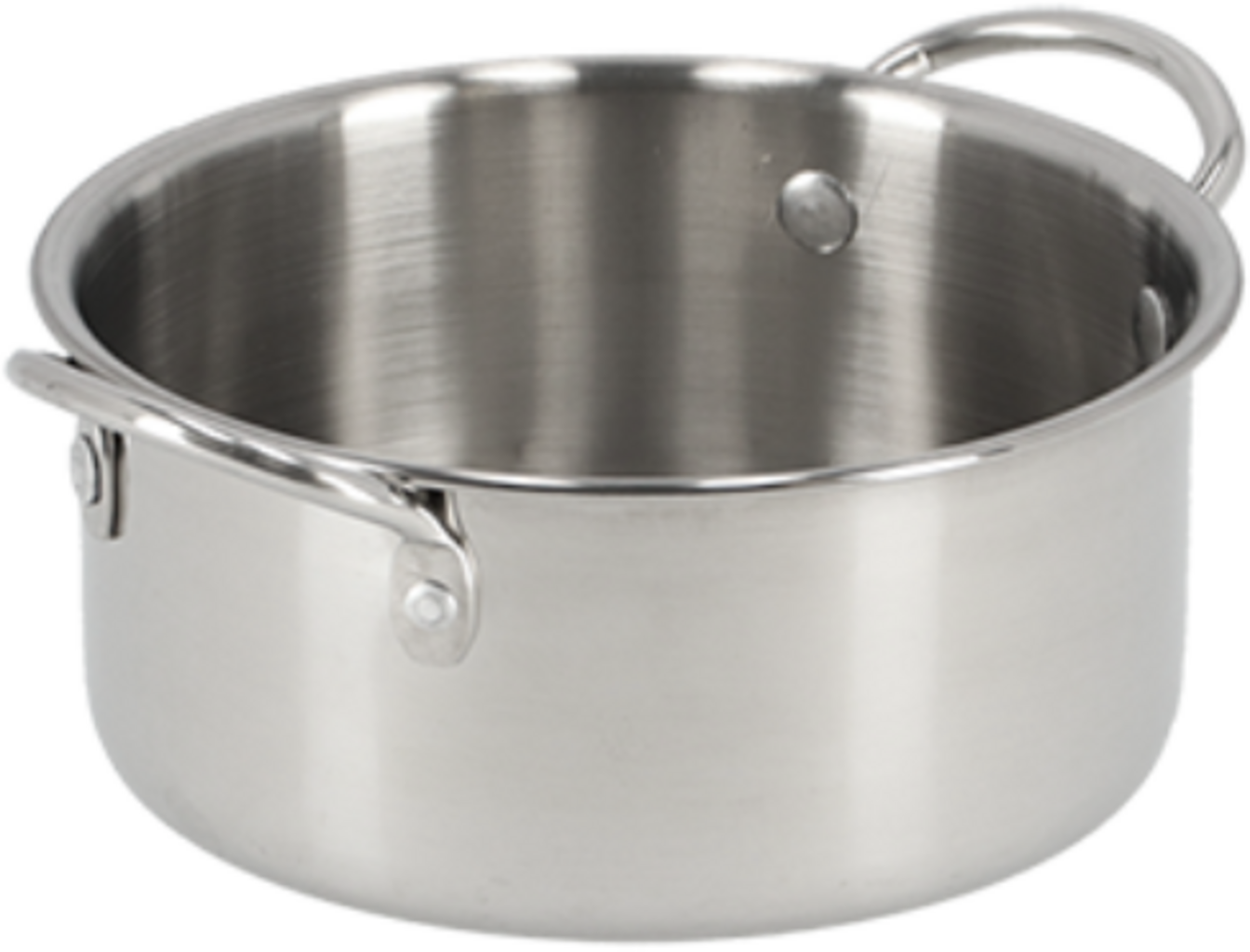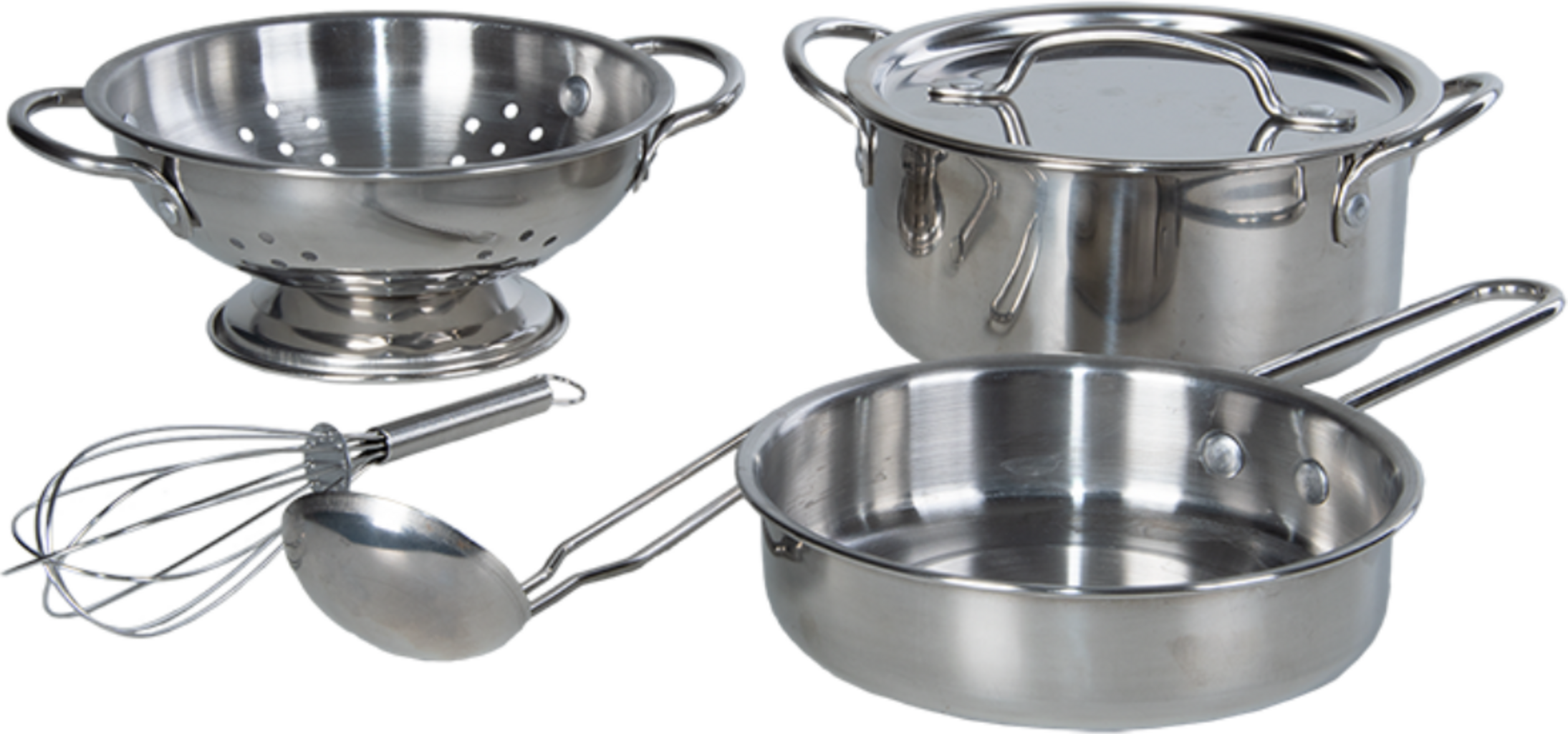 - 6-częściowy zestaw składający się z 1 patelni, 1 garnka, 1 pokrywki, 1 sitka, 1 chochli i 1 trzepaczki