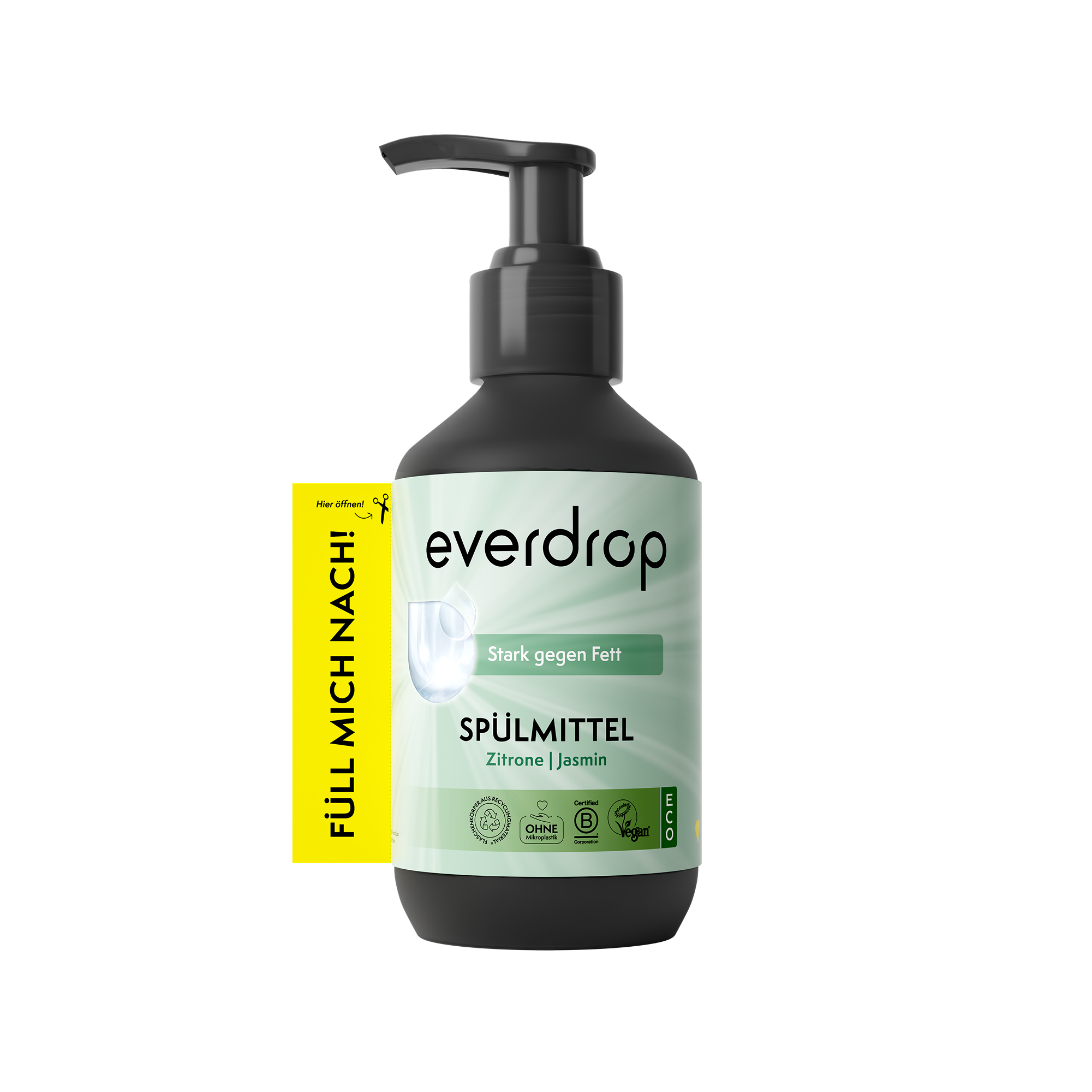 Praktyczna butelka z pompką nadaje się do wielokrotnego napełniania, więc po zużyciu płynu do mycia naczyń można po prostu zmieszać nowy płyn do mycia naczyń z wodą i innowacyjnym everdrop Spülmittel Pulver Sachet, Salbei & Rosenholz od everdrop!
