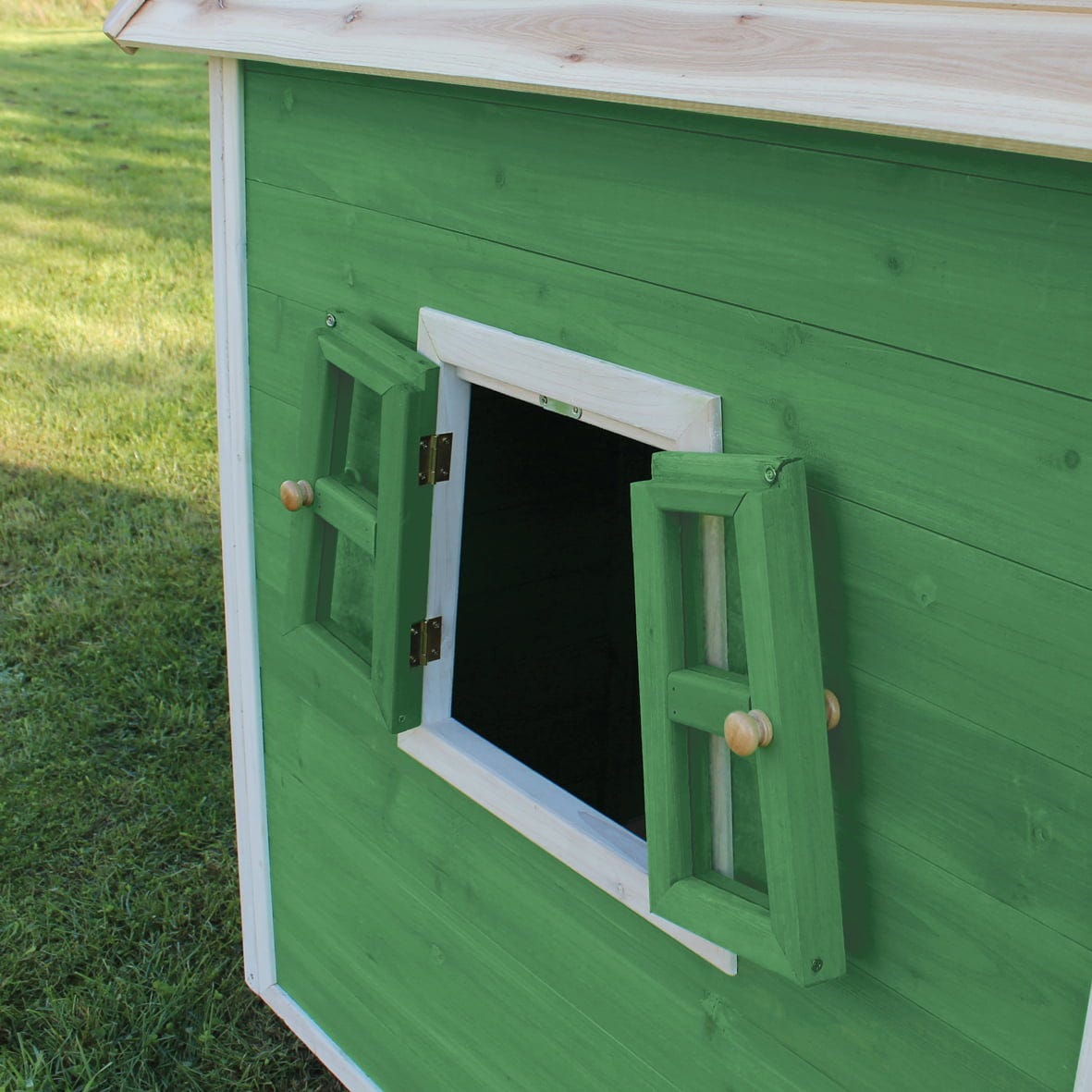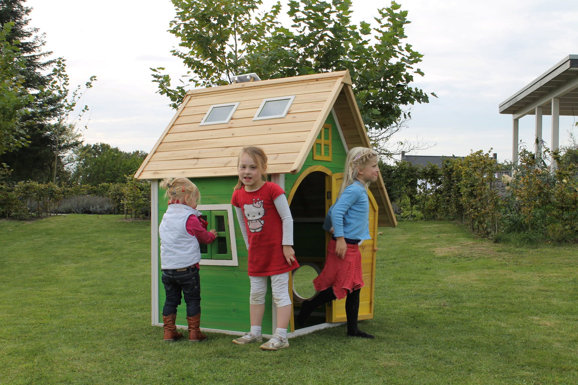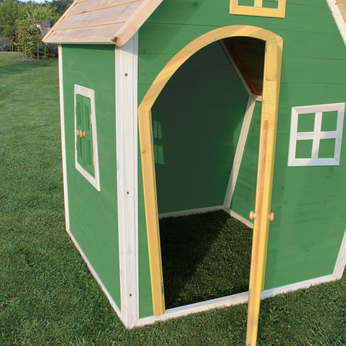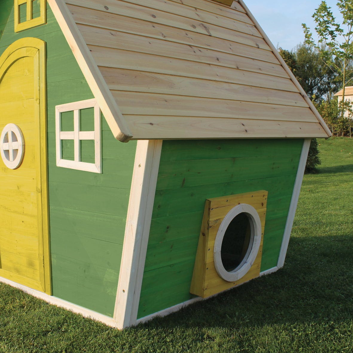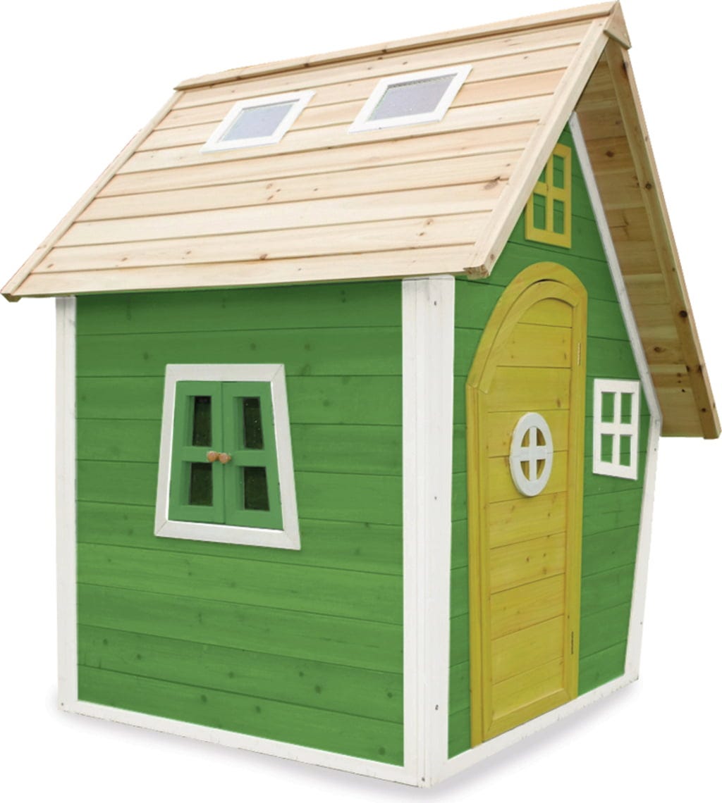 Ten mały drewniany domek do zabawy EXIT Toys zajmuje niewiele miejsca i dlatego pasuje do każdego ogrodu. Wstępnie zmontowane elementy umożliwiają szybki i łatwy montaż. Domek jest wykonany z drewna cedrowego z certyfikatem FSC® (FSC® 100%, FSC® SCS-COC-007799), nie pęka, jest odporny na warunki atmosferyczne i gnicie.