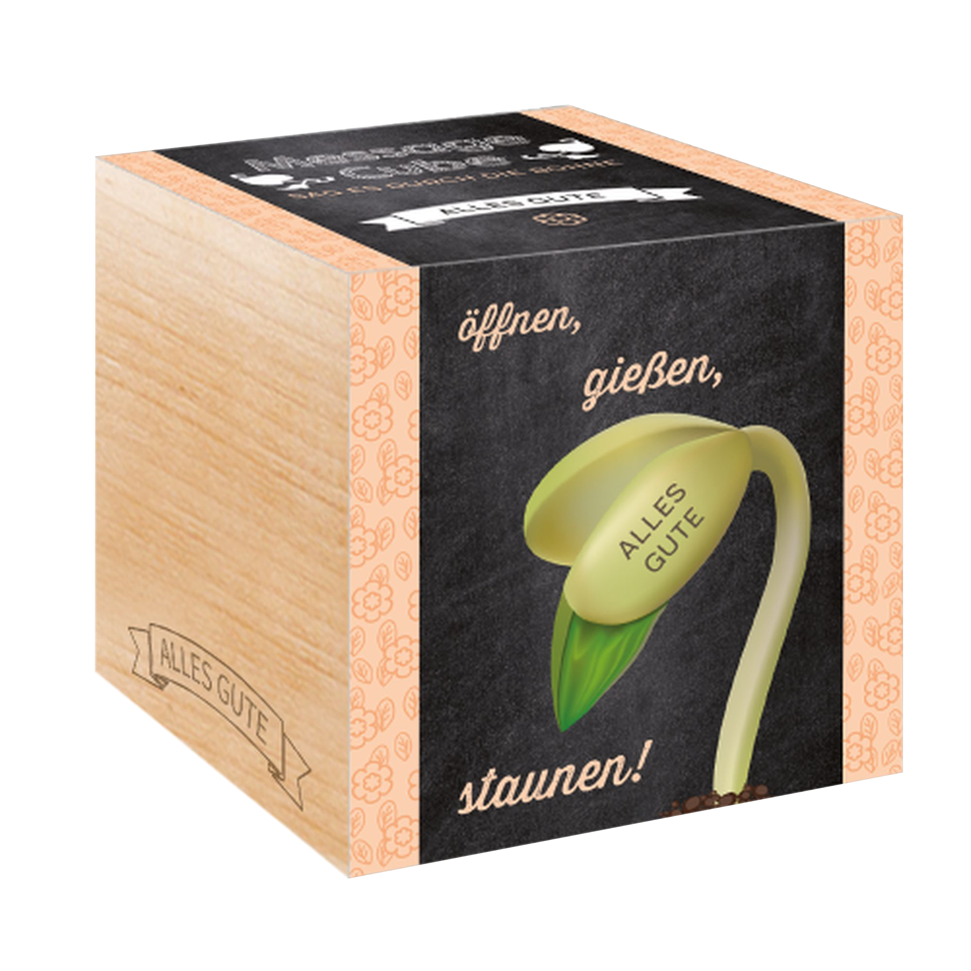 Wystarczy zdjąć naklejkę z kostki, podlać ją, a następnie umieścić w jasnym, ciepłym miejscu. Po kilku dniach kostka ożyje, a z ekologicznego zestawu do uprawy zacznie wyrastać mała zielona fasolka z wygrawerowanymi gratulacjami.